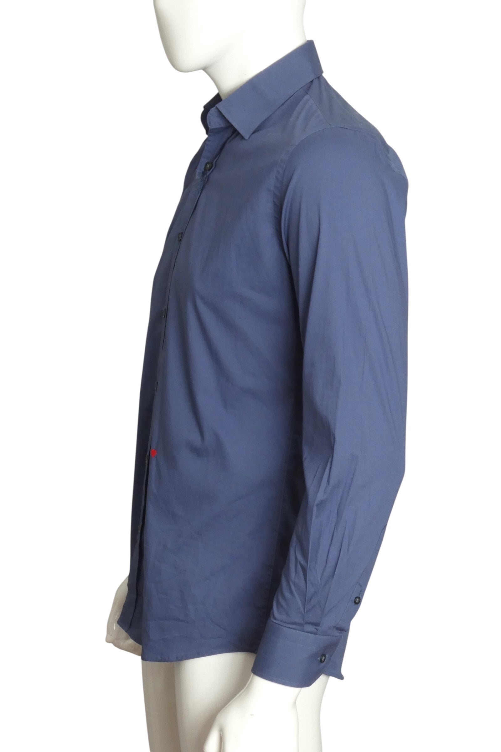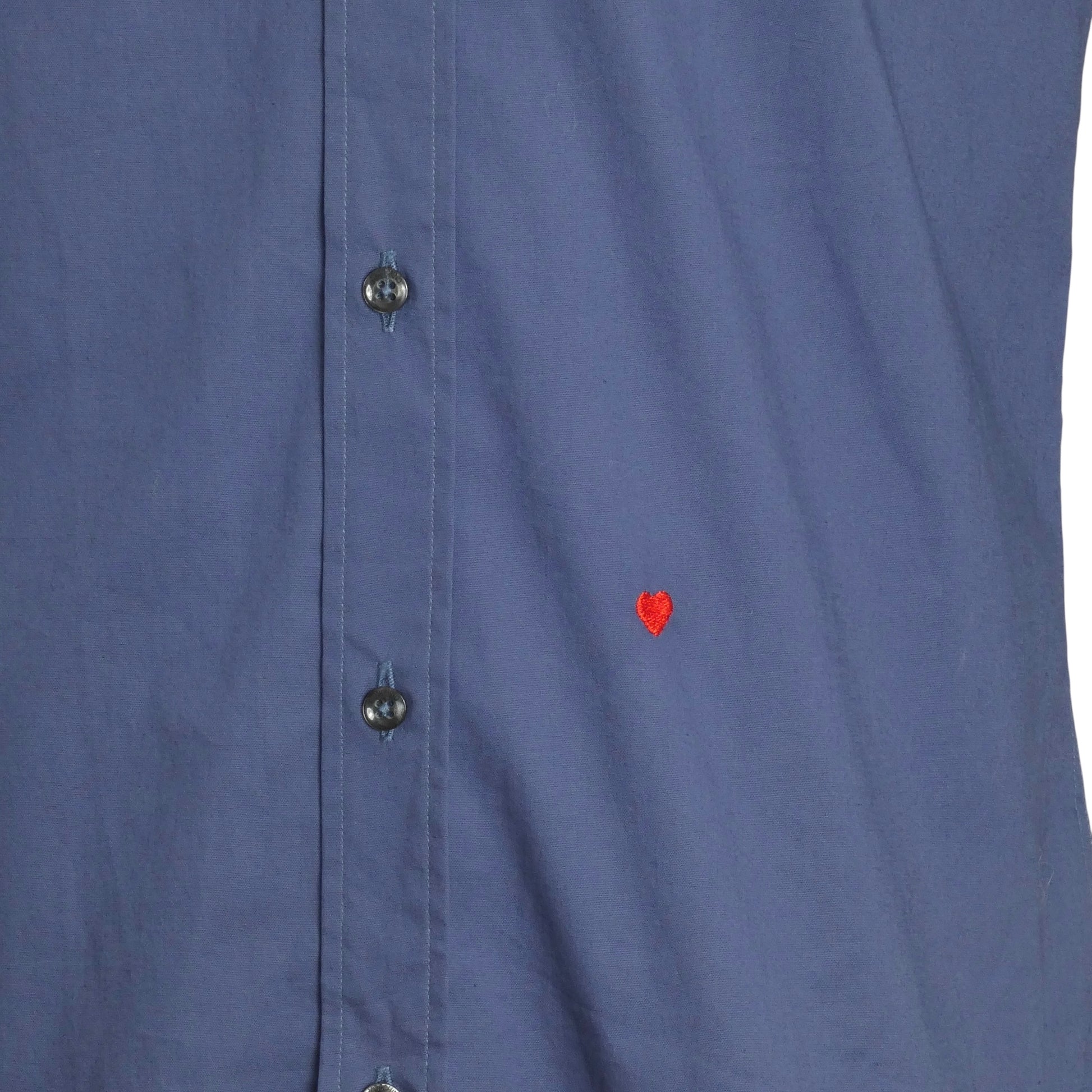 Description: This playful blue cotton twill shirt from MOSCHINO features a small collar and classic button closures down the front. A charming little red embroidered heart adds a dash of whimsy, making it stand out in any wardrobe. Brand new with original tags attached, it's ready to bring a fun pop of color and personality to your look. Perfect for those who love style with a cheeky twist!
