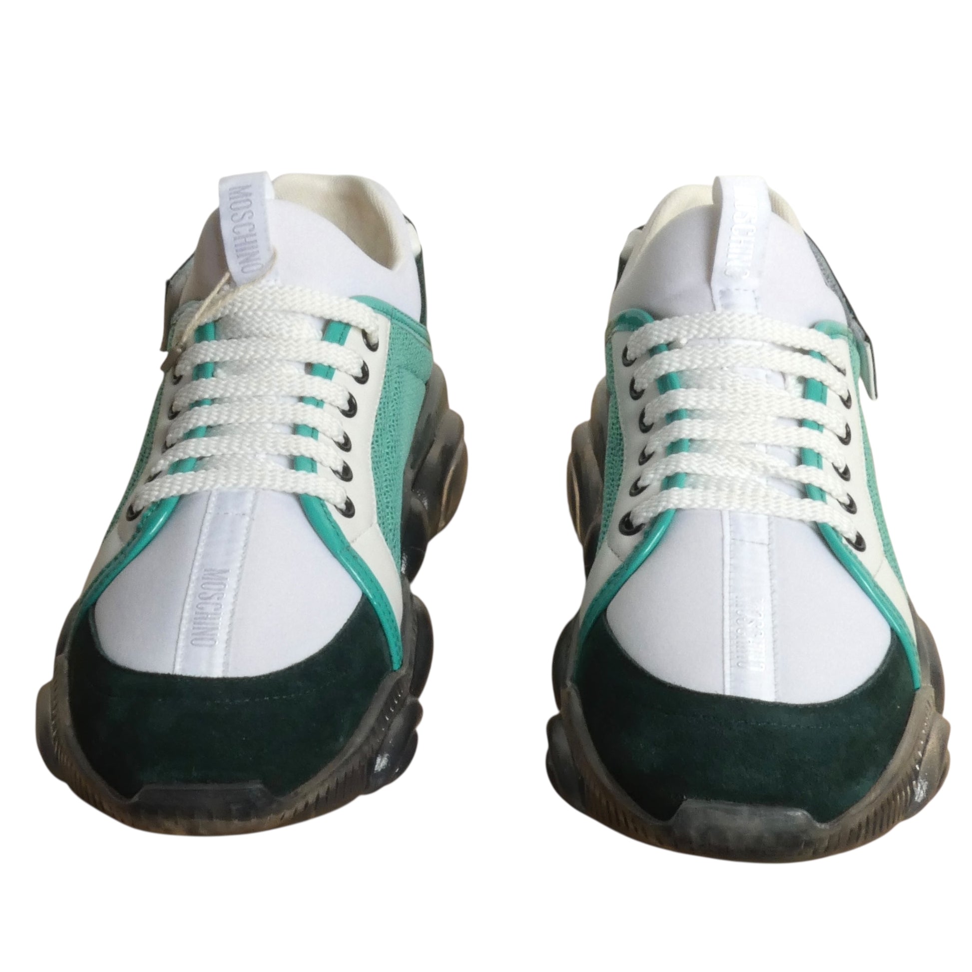 Description: Step into bold style with these MOSCHINO Teddy Sole Sneakers, a fearless fusion of playful design and premium craftsmanship. The white mesh and leather upper features striking green and dark accents, while the showstopping transparent rubber sole sculpted into an unmistakable teddy bear shape commands attention from every angle. Crafted from quality mesh, calfskin, suede, and synthetics, these size-44 sneakers deliver comfort without compromising on edge. Still in original packaging, they're ready to make a daring statement in your rotation.