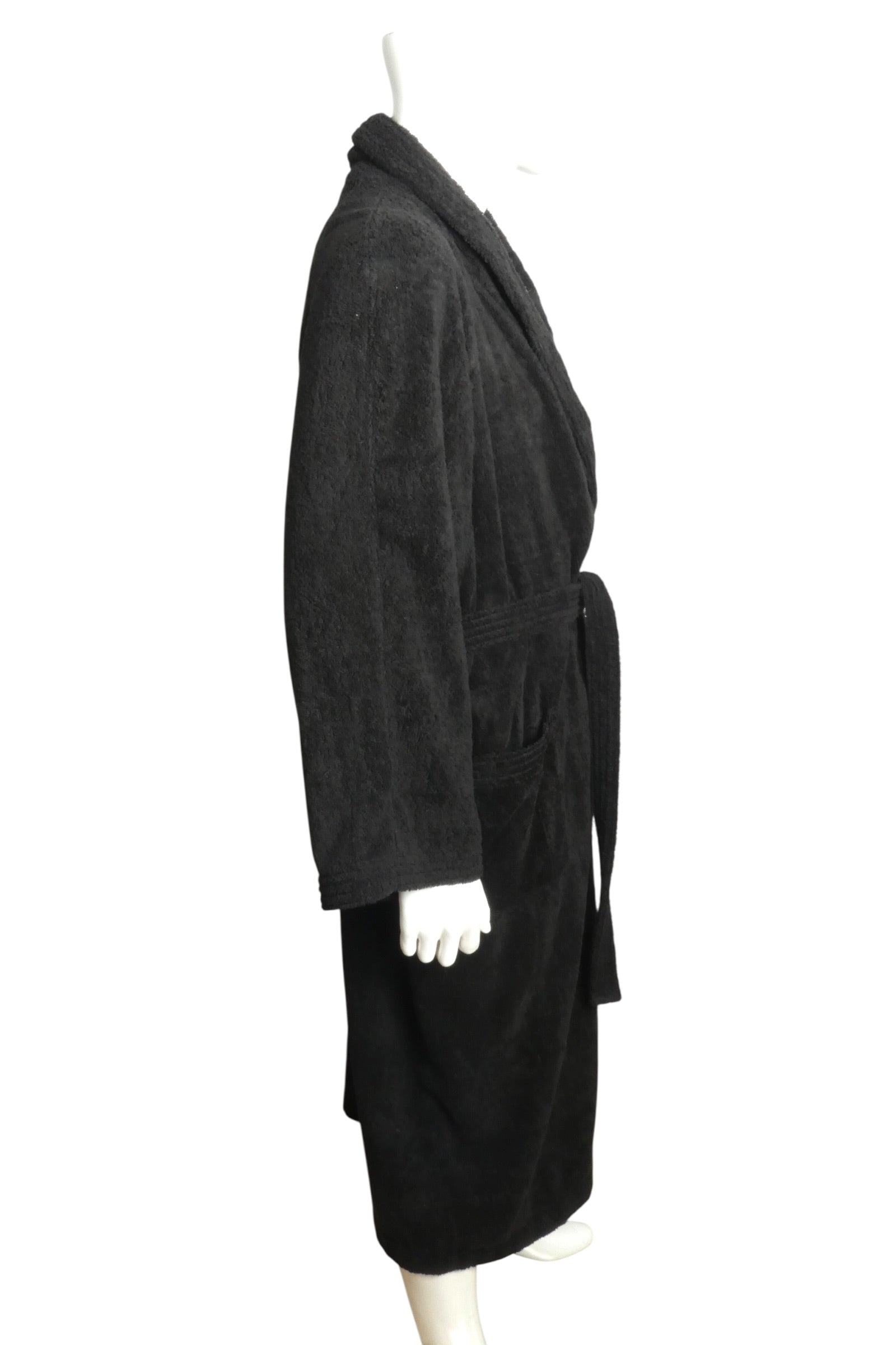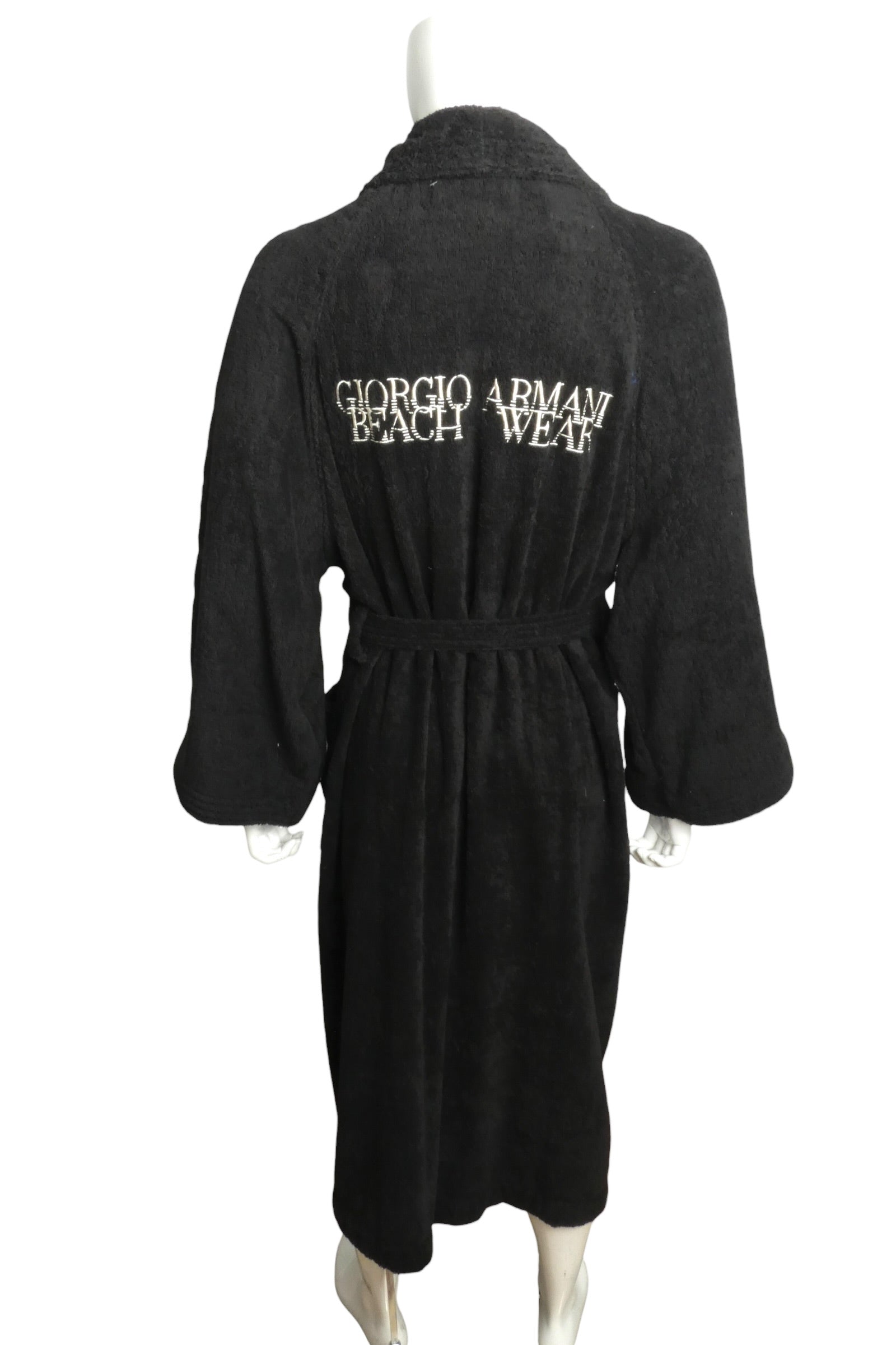 Description: Black terry cloth robe from Giorgio Armani Swimwear, perfect for resort poolside lounging. Features the iconic Giorgio Armani embroidered across the back, a sash belt, and practical patch pockets on the front. Crafted from 100% cotton terry for comfort and absorbency. A timeless piece from the 2000s for elevated resort wear.