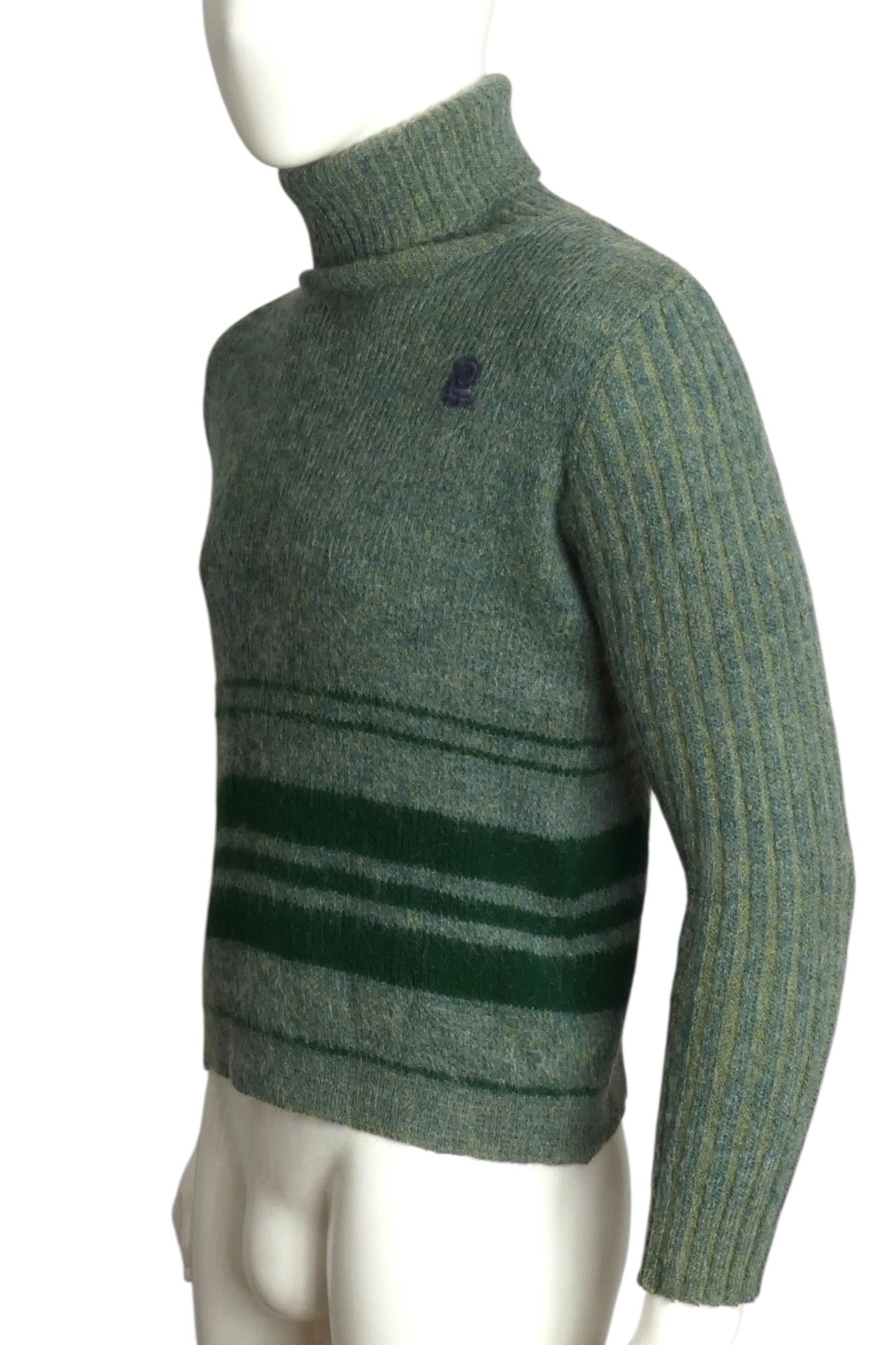 Description: Elevate your vintage wardrobe with this stunning 1970s wool and angora sweater, featuring a chic turtleneck and stylish stripes around the midriff. The ribbed knit sleeves add a touch of texture, while the iconic Cardin logo on the chest showcases your appreciation for timeless fashion. Perfect for layering or wearing solo, this sweater combines warmth and elegance, making it a must-have for any fashion enthusiast.