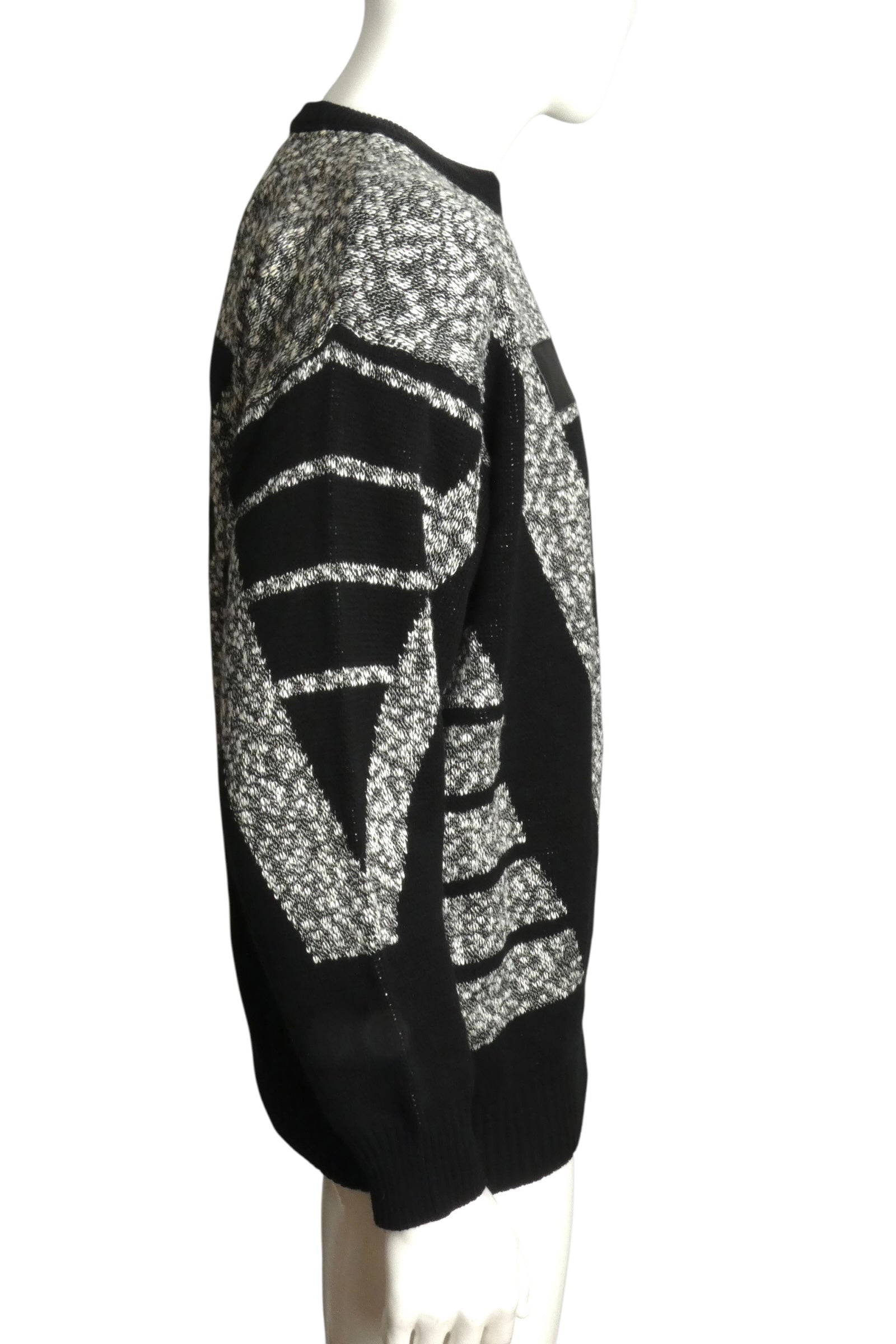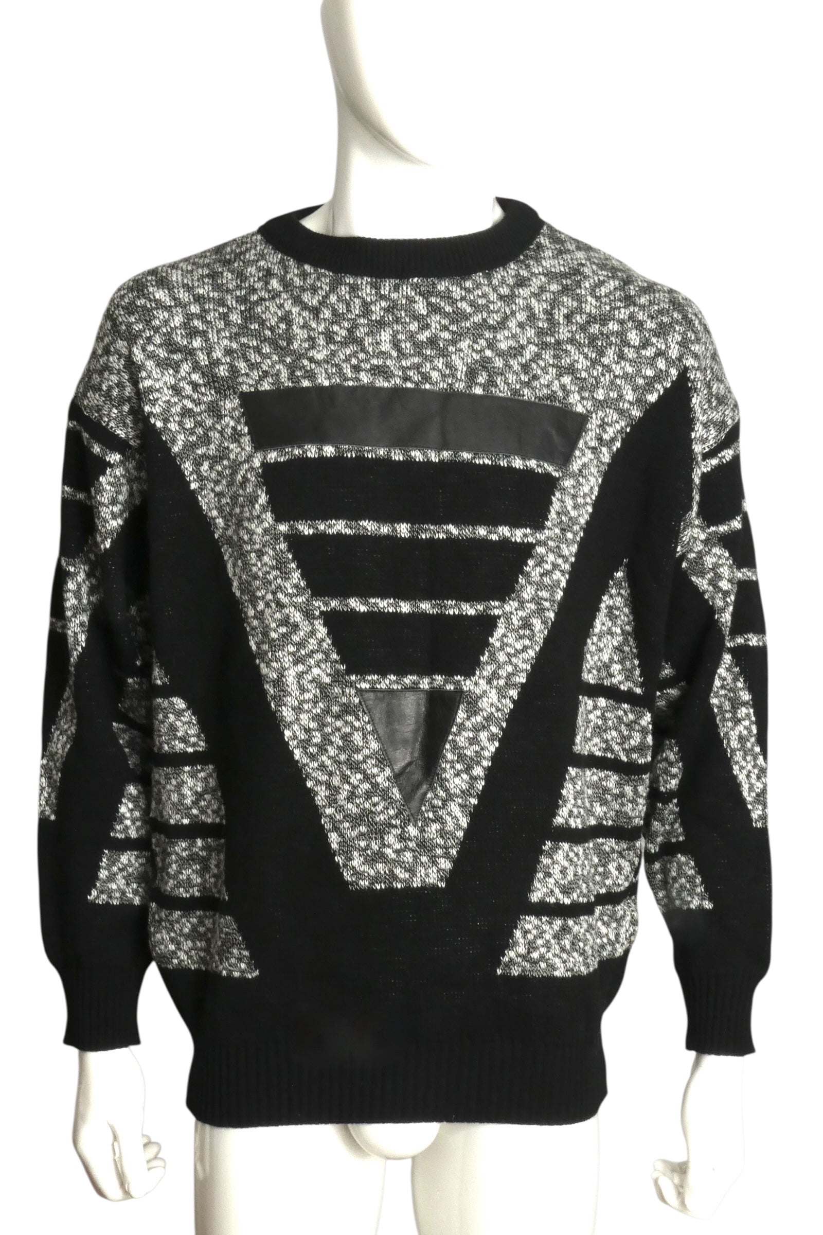 Description: Step back into the bold 1980s with this Pierre Cardin sweater! Featuring a striking black and white graphic print, it flaunts a unique triangle of stripes down the front, topped with an eye-catching leather applique stripe. Perfect for anyone who loves vintage flair with a playful edge, this size-large acrylic and leather blend keeps you cozy while standing out in style.