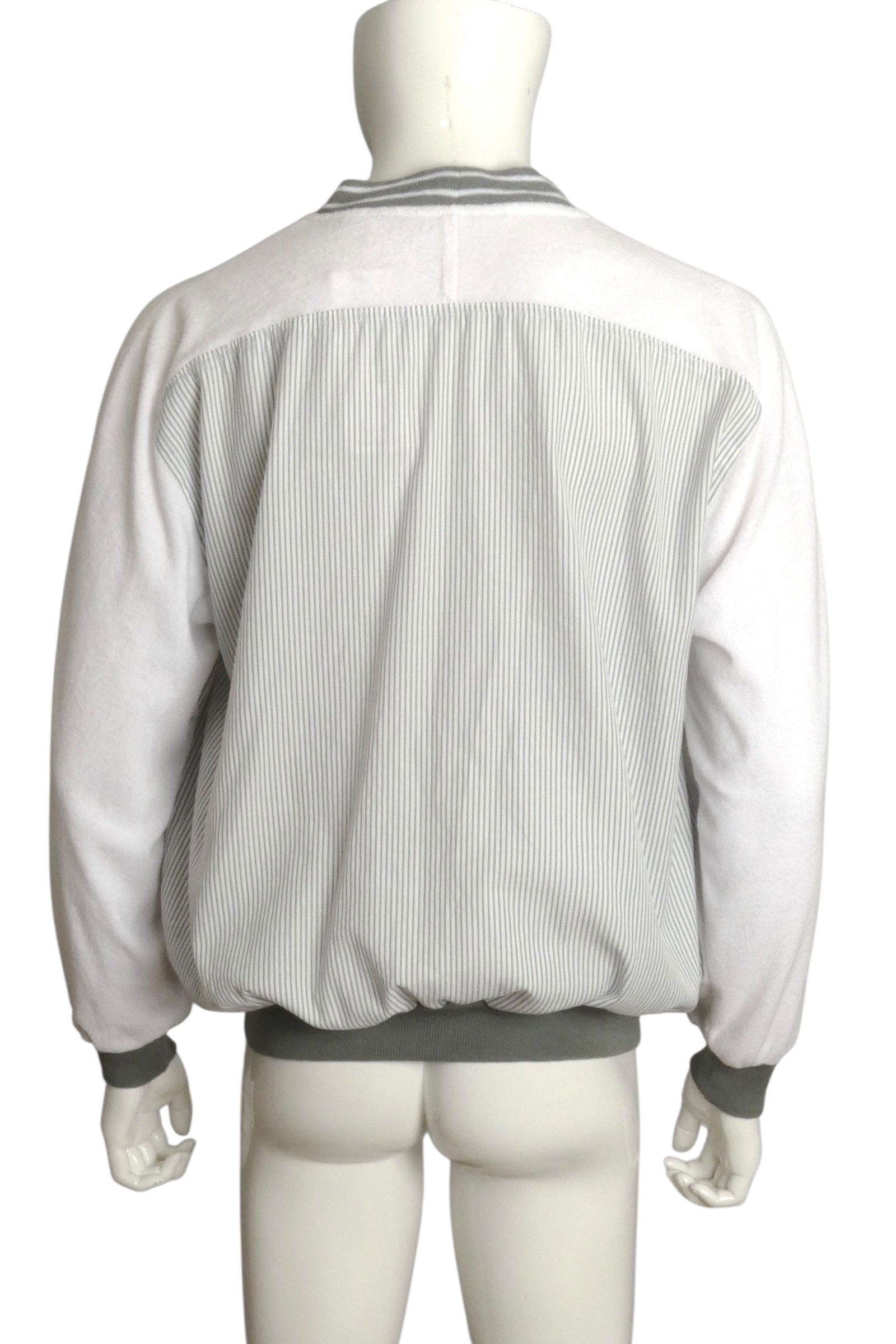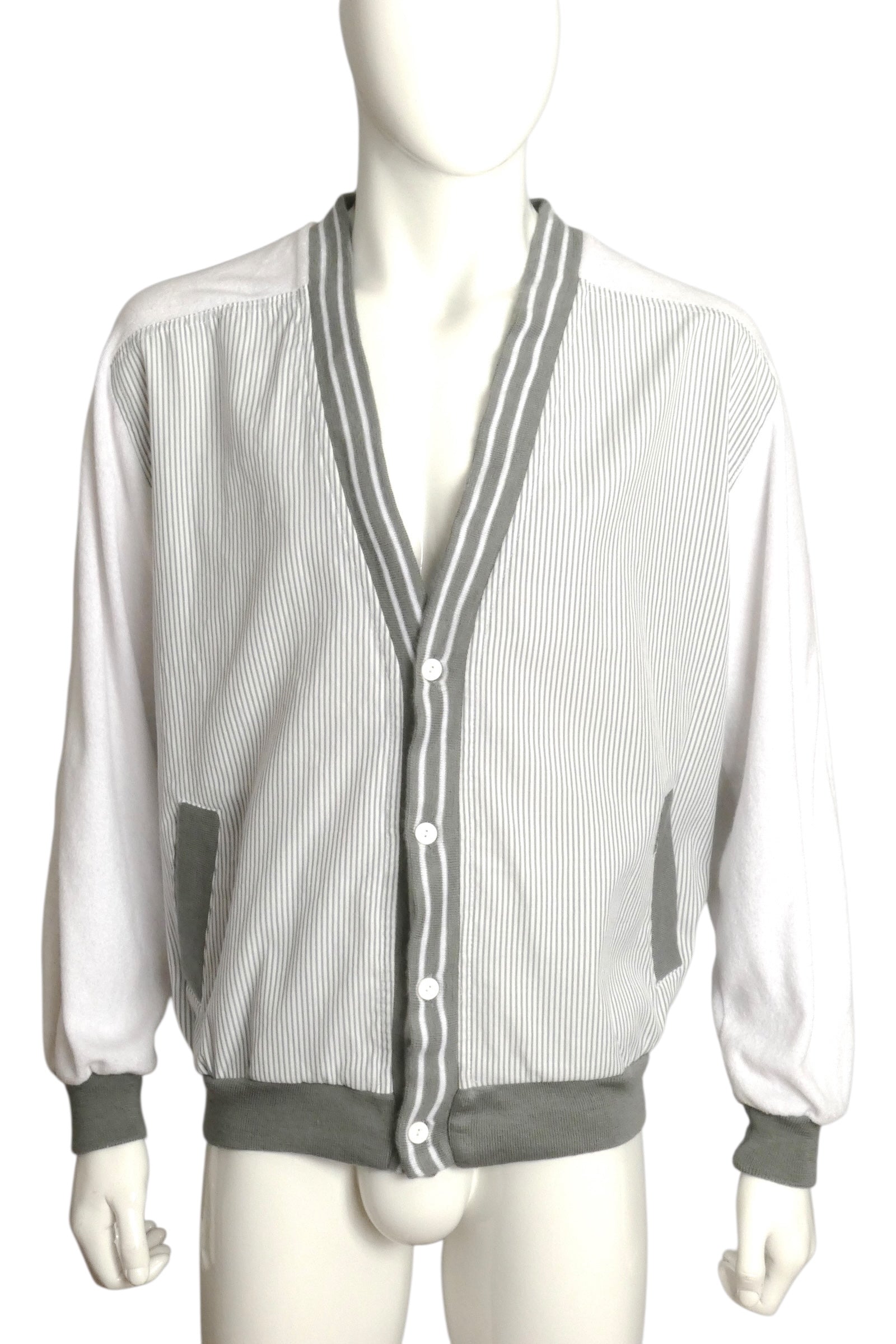 Description: This 1980s Pierre Cardin cardigan captures the essence of resort-ready style with its sophisticated color-blocking design. The grey and white striped cotton body pairs beautifully with a luxurious white terry cloth shoulder yoke and sleeves, finished with grey knit cuffs for refined contrast. A striped knit neckband and placket with button closures add vintage charm, while functional inset pockets with knit welts provide practical elegance. Perfect for layering over summer dresses or pairing with linen trousers, this piece brings authentic vintage sophistication to any warm-weather wardrobe. A timeless investment from an iconic designer.