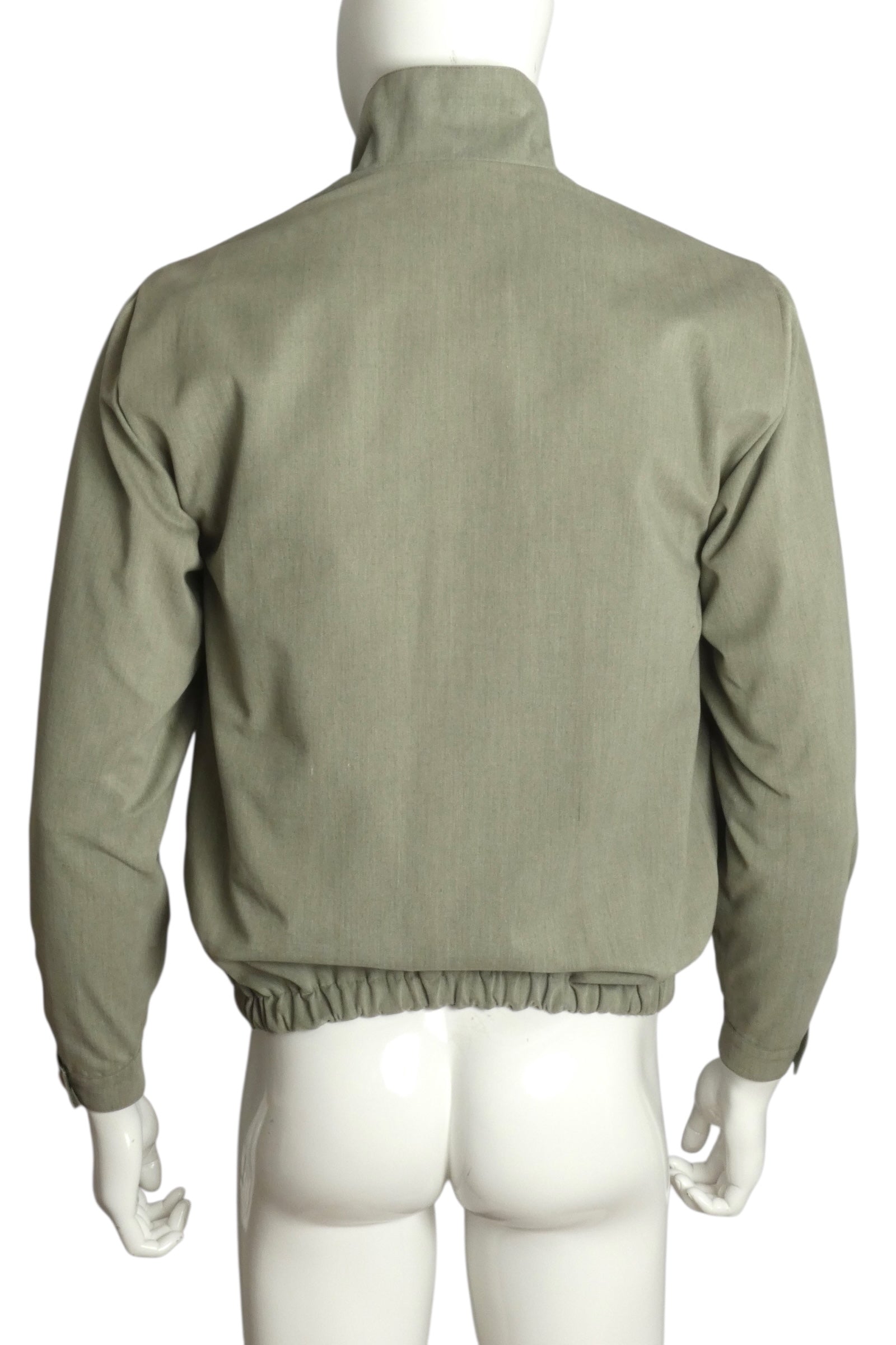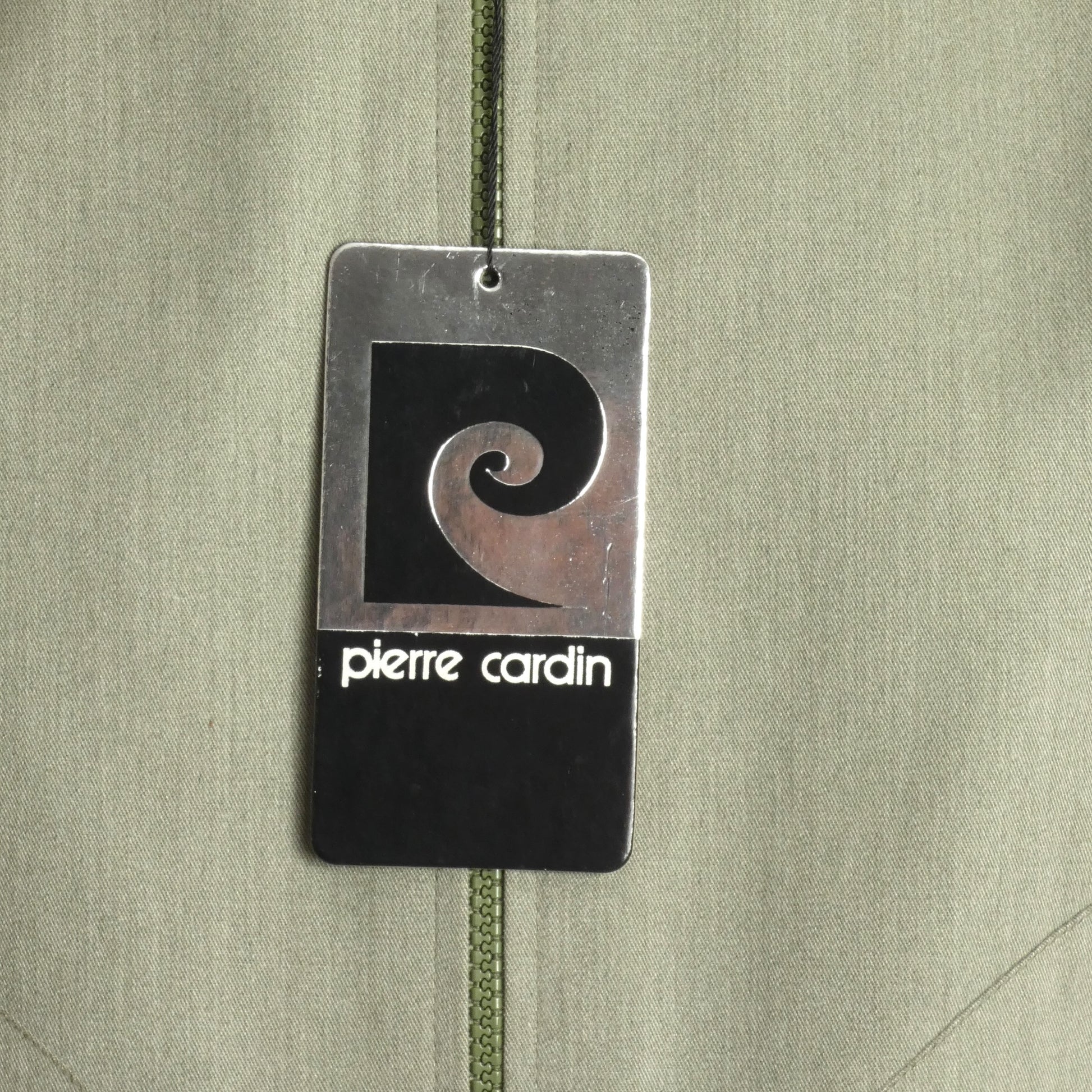 Description: Discover authentic 1980s fashion with this unworn Pierre Cardin suit, complete with original store tags. The reversible cotton jacket shifts between light and dark green, offering dual styling options. Notable features include a structured standing collar, zippered front fastening, embroidered logo accent, and functional inset pockets. Long sleeves terminate in pleated cuffs with button closures. The accompanying trousers showcase a streamlined straight-leg cut with a flat front and strategically placed darts at the back waistband for a refined fit. This vintage ensemble exemplifies the decade's distinctive approach to casual tailoring with both practicality and sophistication.