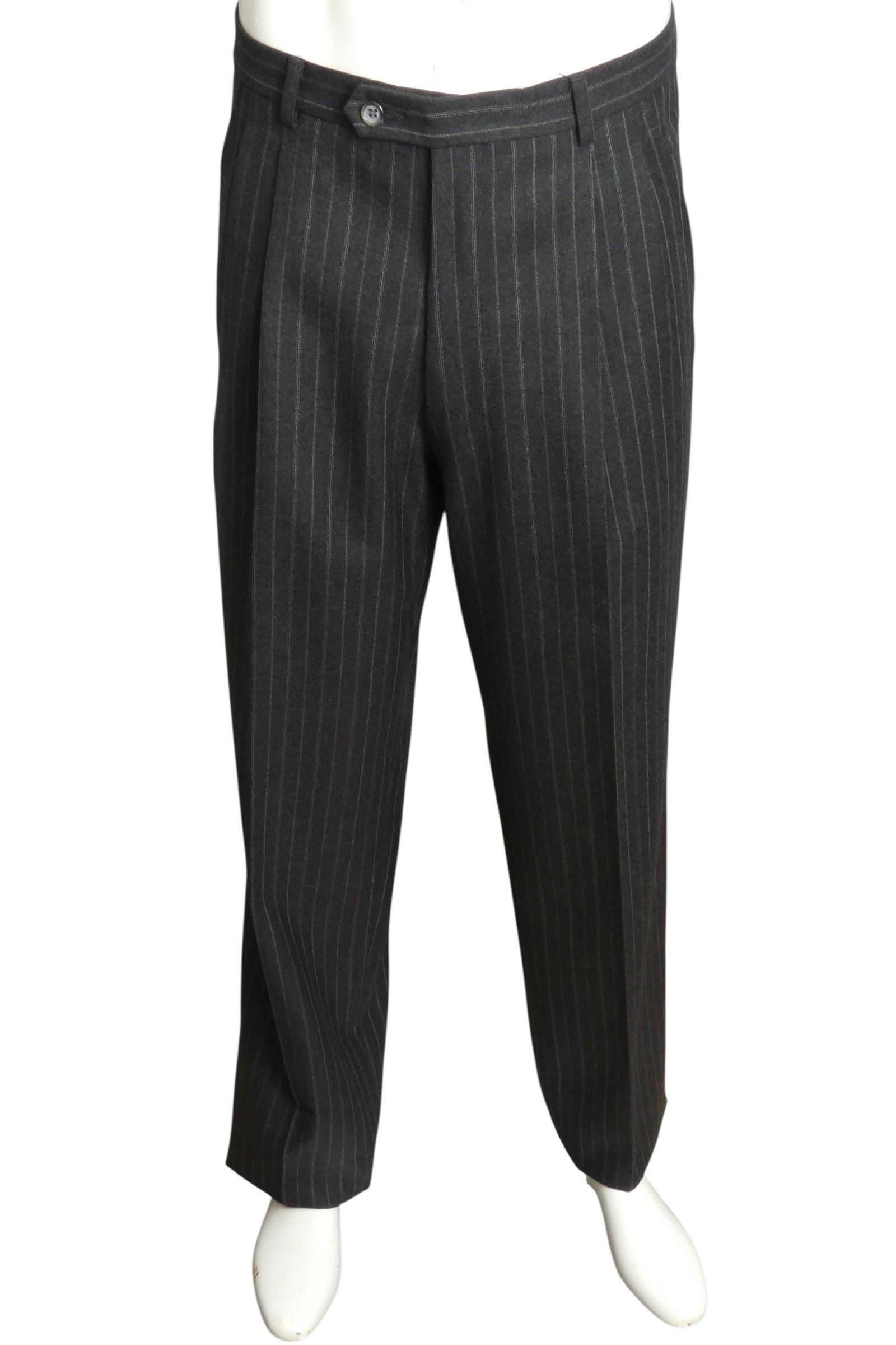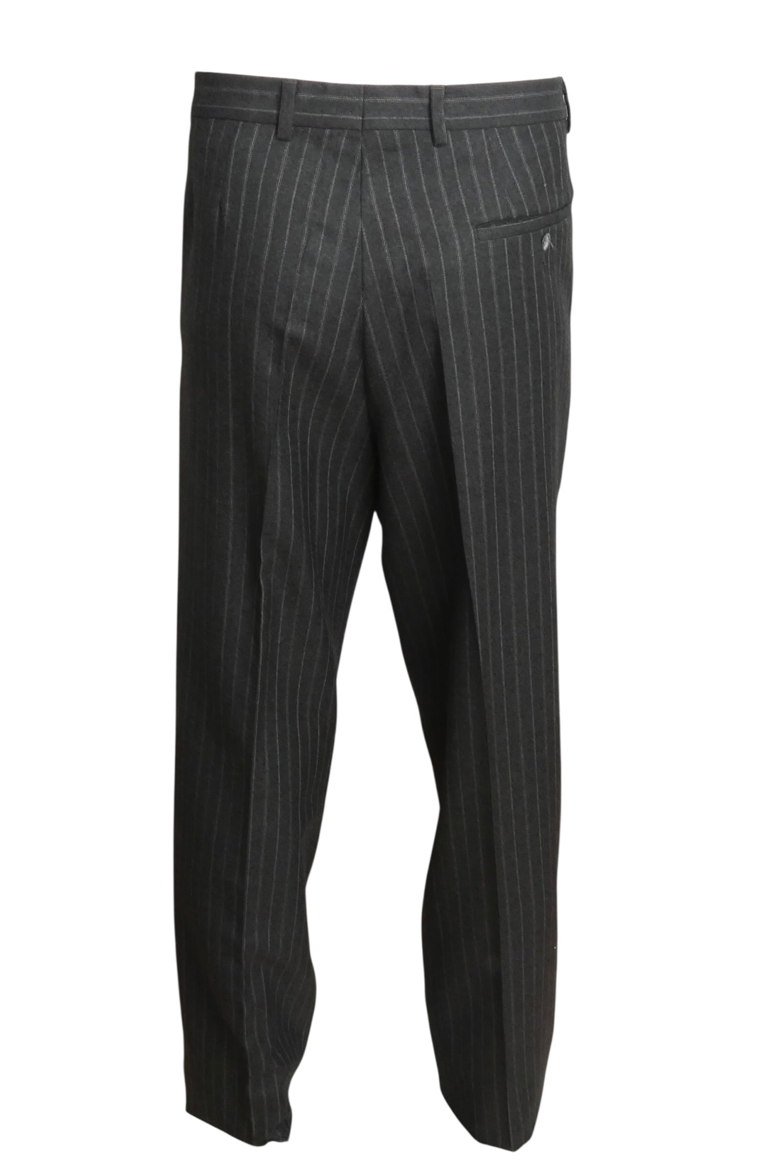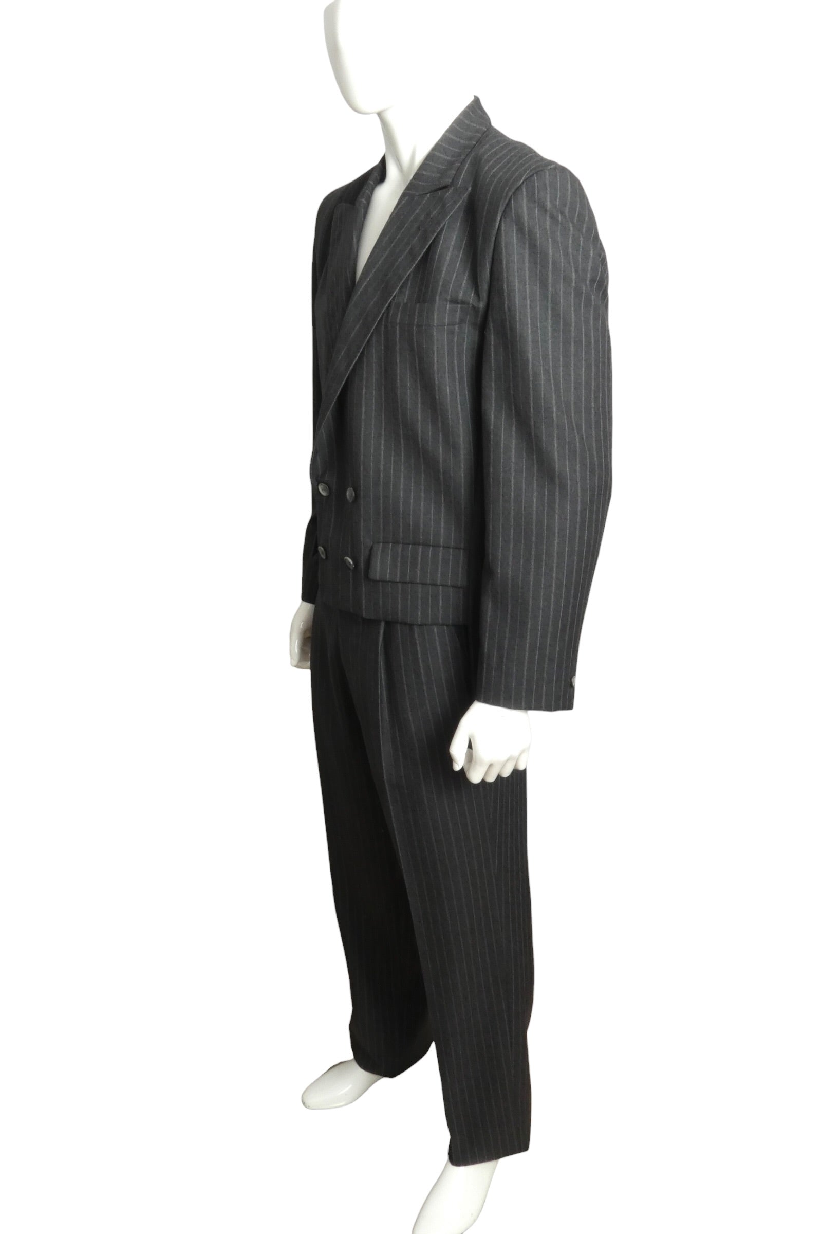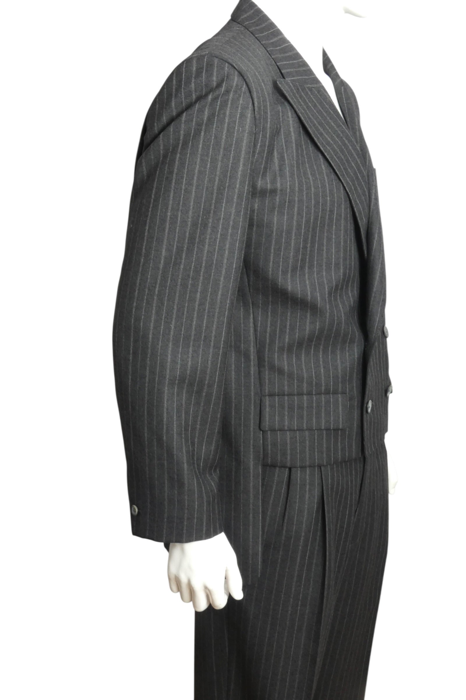 Description: This 1989 Pierre Cardin suit exemplifies the designer's bold approach to tailoring during the late 1980s. Crafted from 100% wool, the piece features a striking grey and red pinstripe pattern paired with a structured double-breasted silhouette. The exaggerated peak lapels and distinctive 6x2 button configuration showcase Cardin's avant-garde sensibility, while the boxy, cutaway tailcoat style represents an iconic design signature of the era. A remarkable archival piece that captures the innovative spirit of high fashion from this pivotal decade.