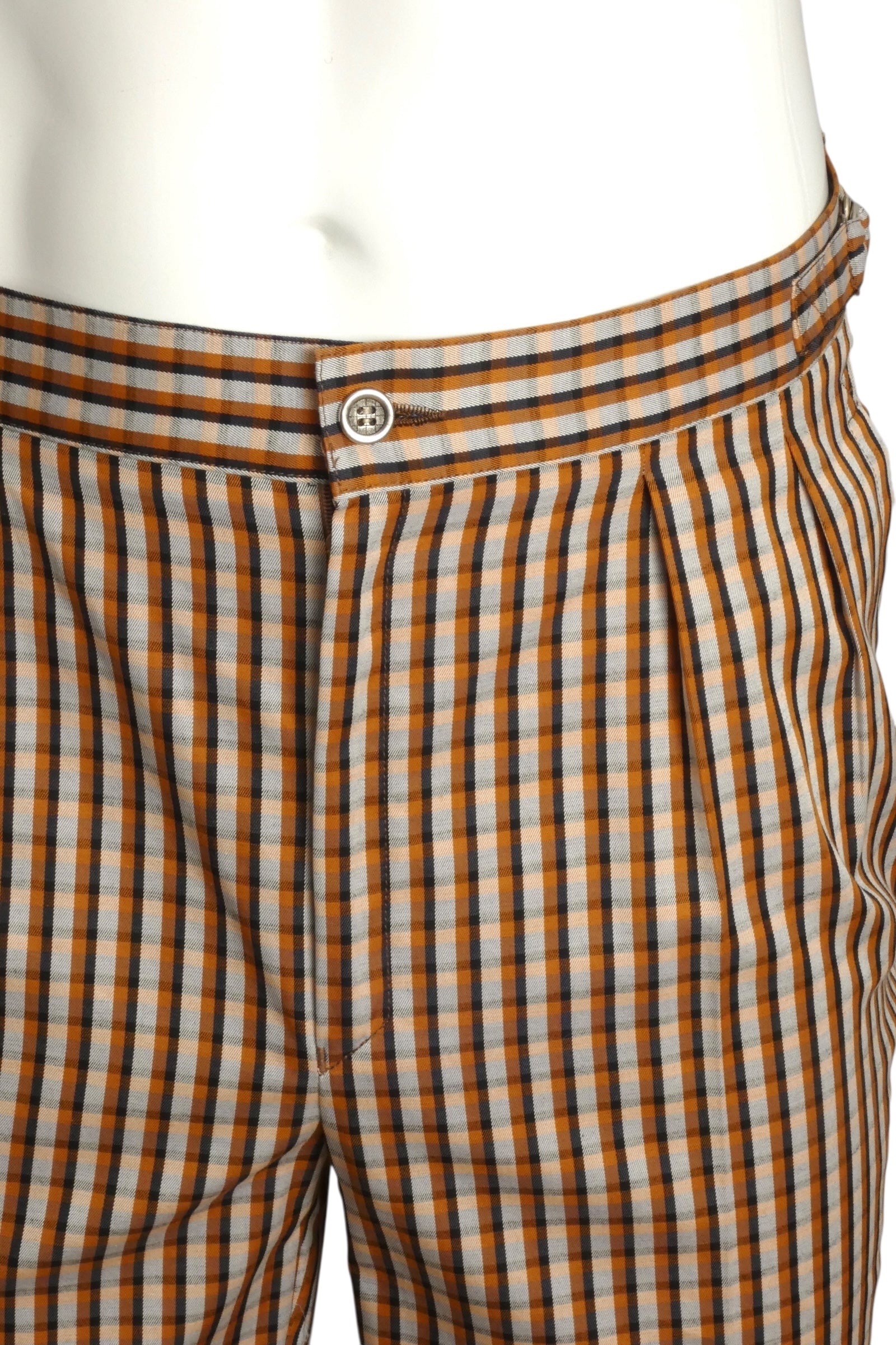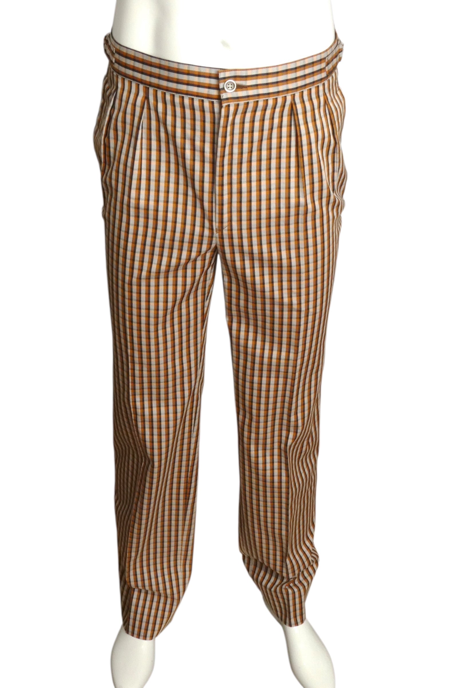 Description: This exceptional Pierre Cardin resort suit from the early 1990s exemplifies the era's sophisticated leisure wear. The reversible jacket features a striking white and brown cotton stripe on one side with plaid detailing, while the reverse showcases luxurious tan terry cloth. A commanding Mandarin collar and functional patch pockets enhance its distinctive silhouette, secured by a smooth zipper closure. The coordinating pants showcase the same plaid pattern in deeper tones, featuring crisp pleated fronts and tapered legs for a refined fit. A versatile piece that transitions seamlessly between resort settings and casual sophistication.