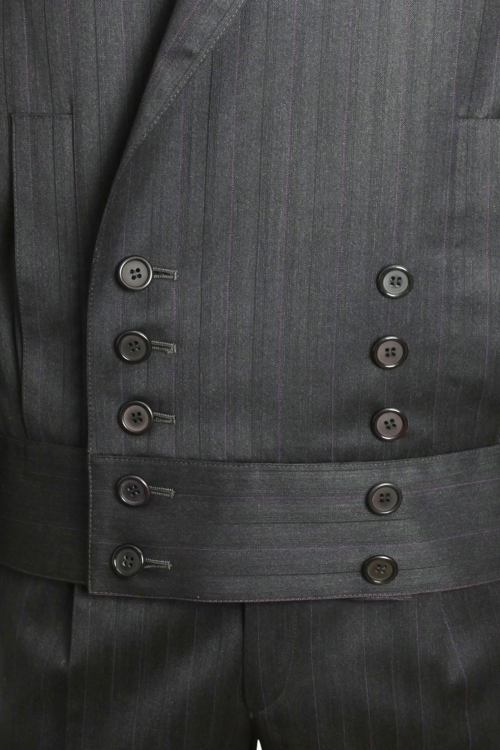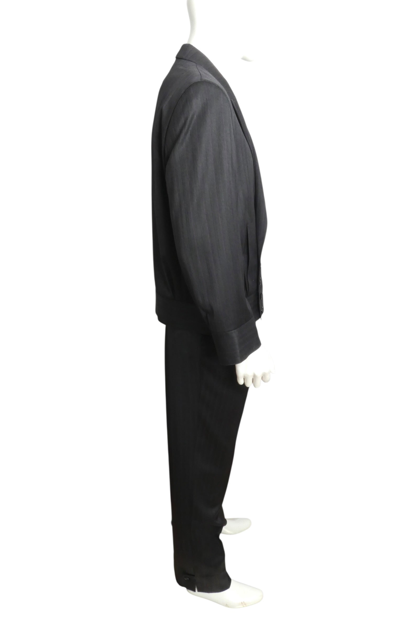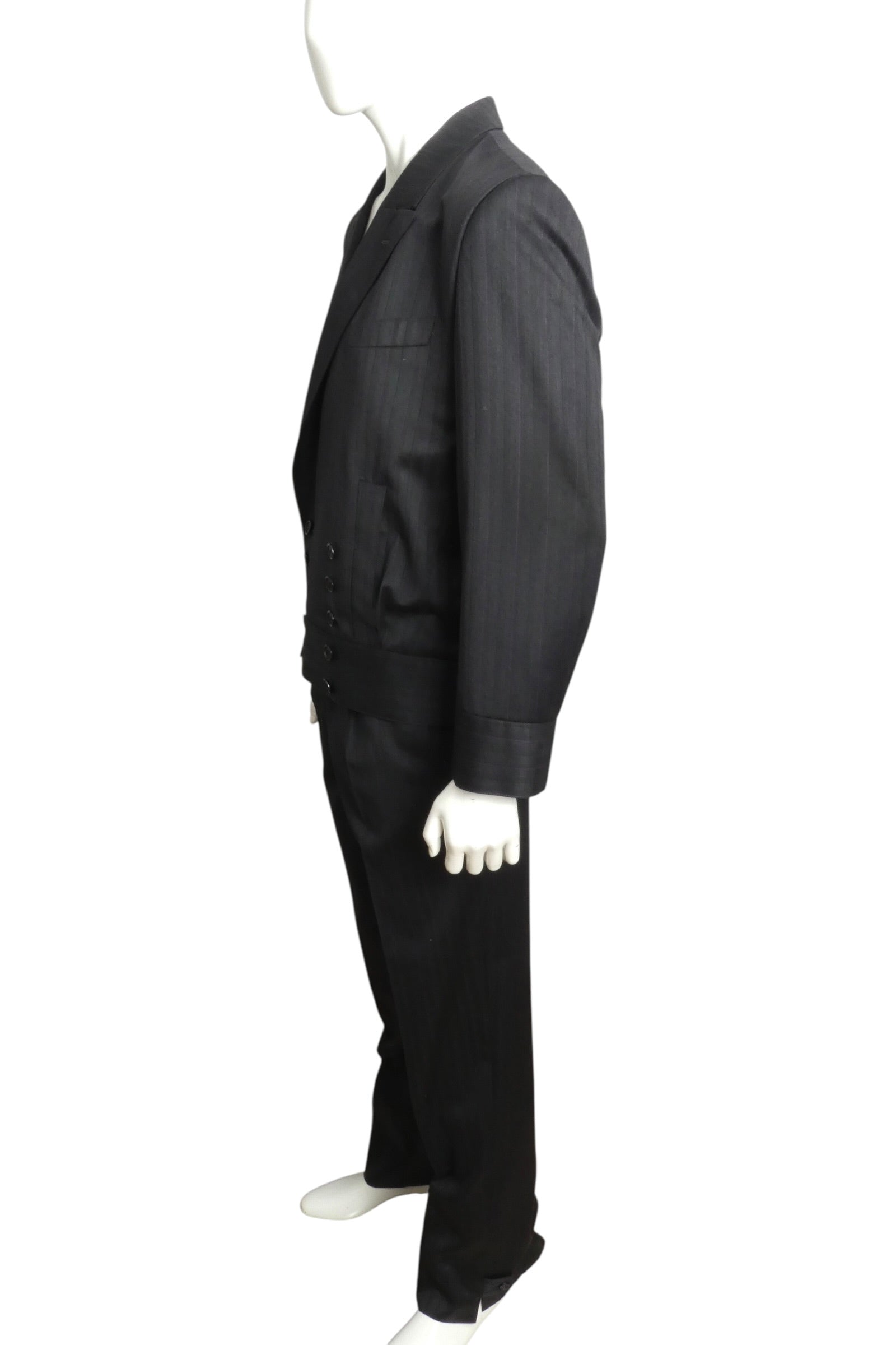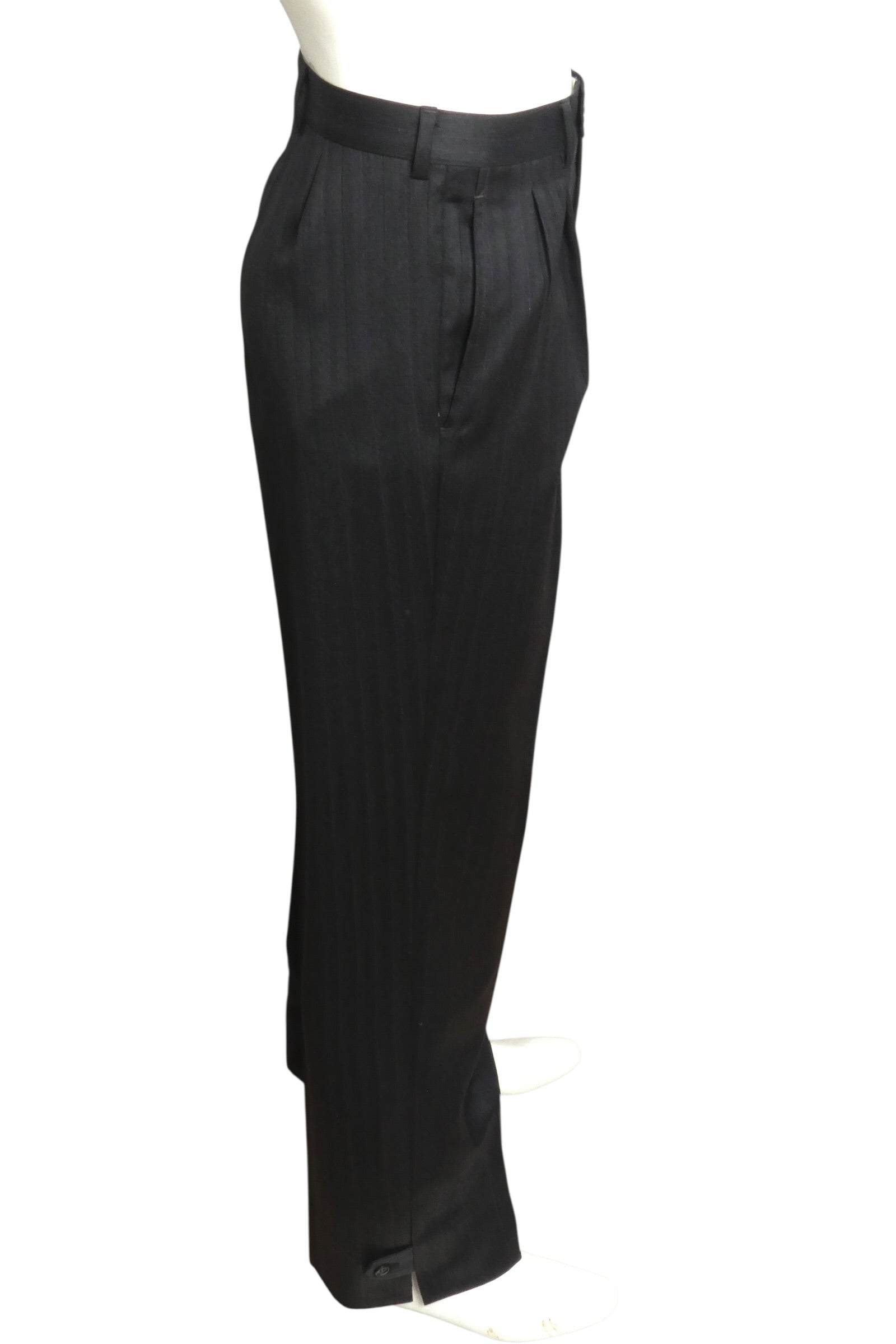Description: This exceptional Pierre Cardin suit from the 1991 collection exemplifies the designer's signature tailoring mastery. Crafted in luxurious black wool pinstripe, the cropped jacket features a commanding wide waistband and ten double-breasted snap closures, complemented by sharp peak lapels and an inset chest pocket. Generous welt pockets at the stomach provide both style and function. The pleated front slacks showcase Cardin's distinctive design with elegant side seam slits at the ankles, finished with tab and button closures. A timeless investment piece for the discerning collector of vintage couture.