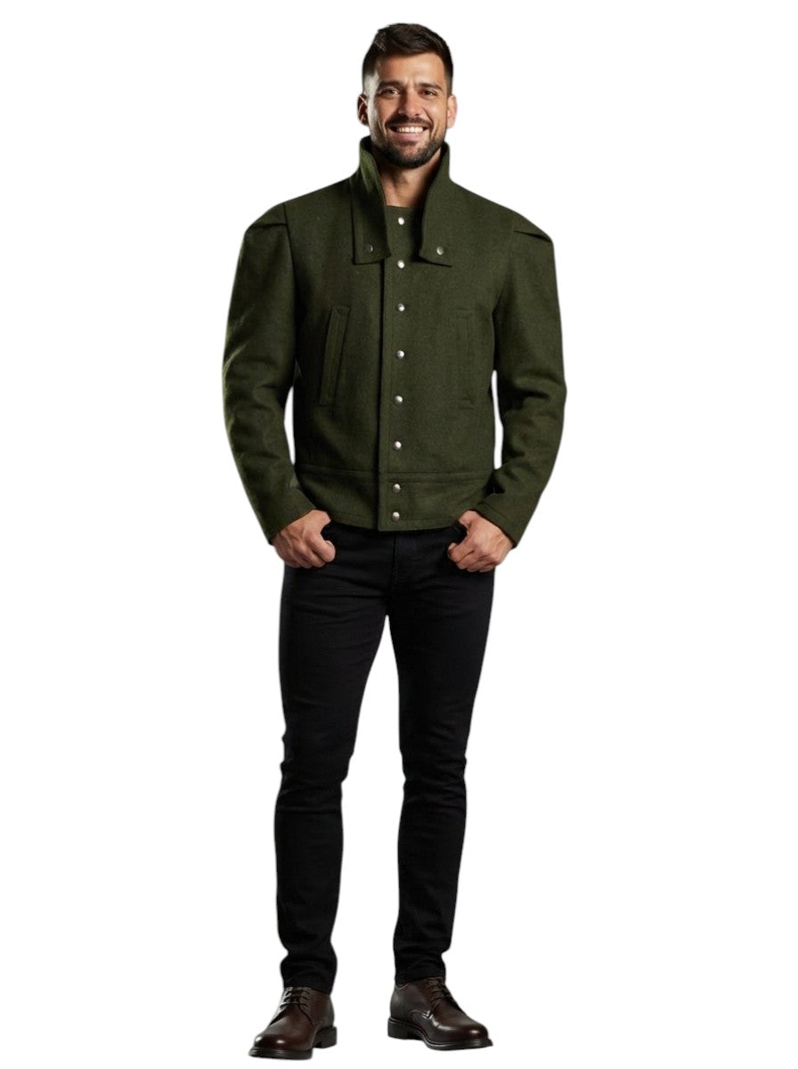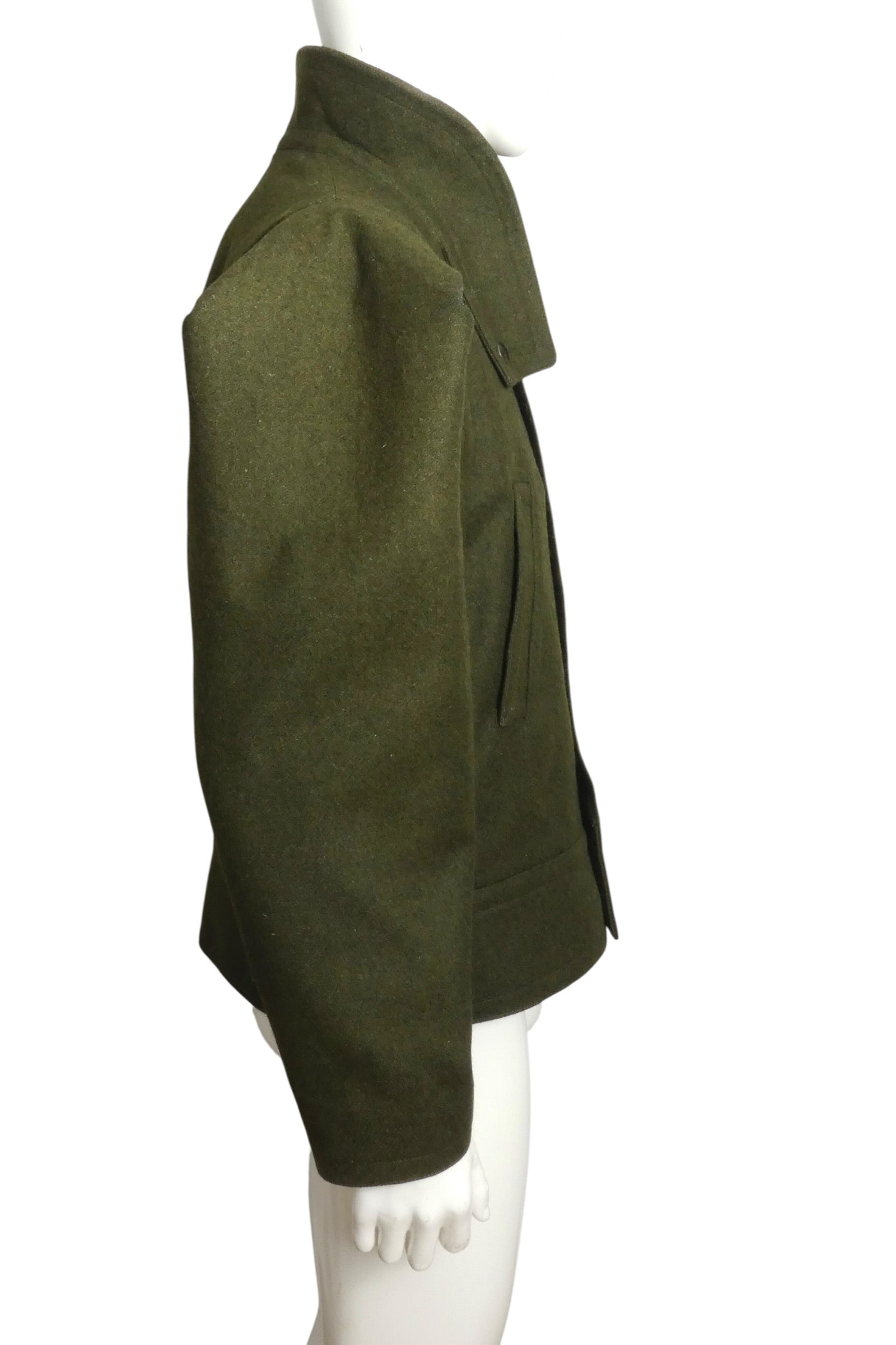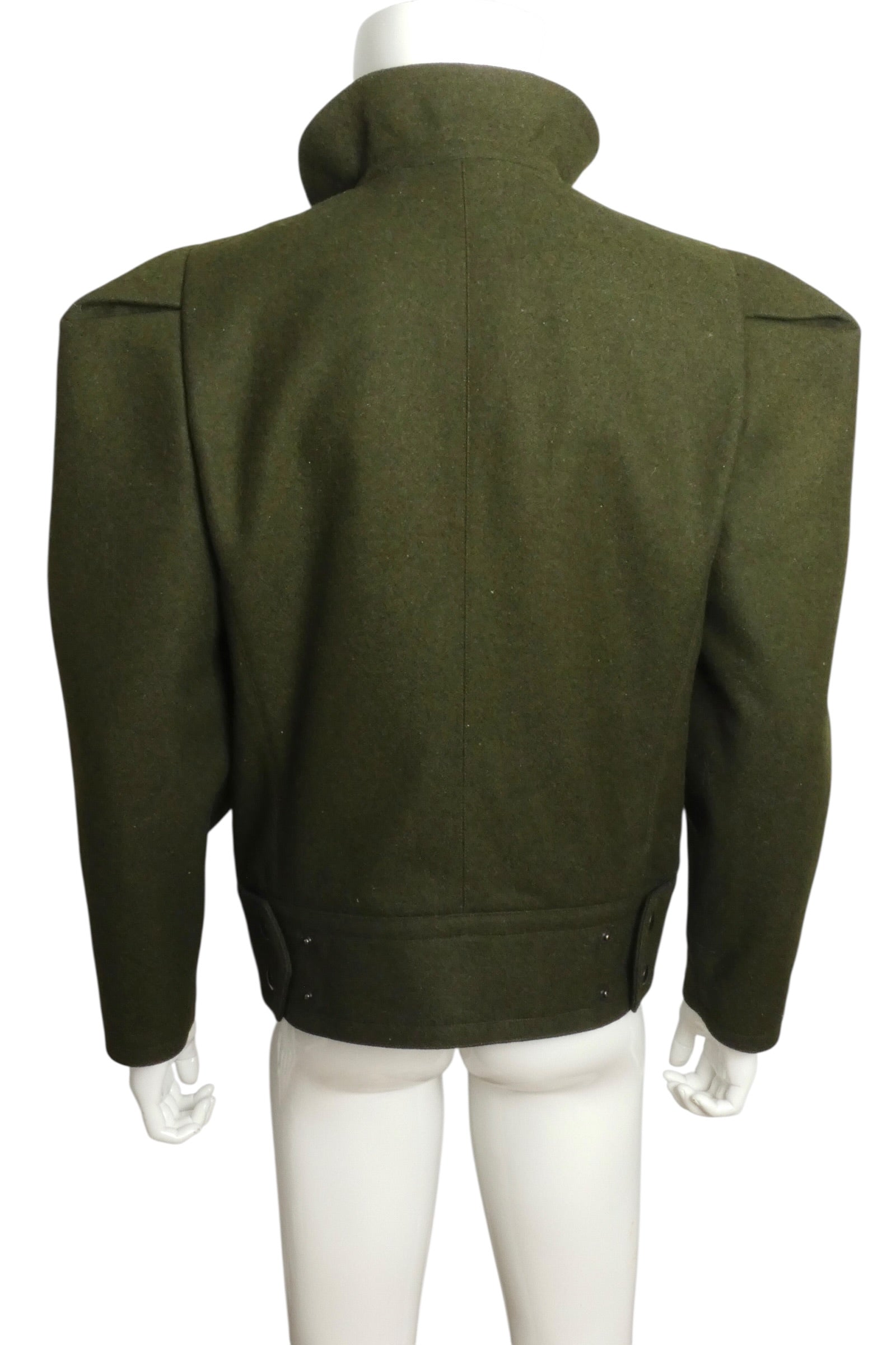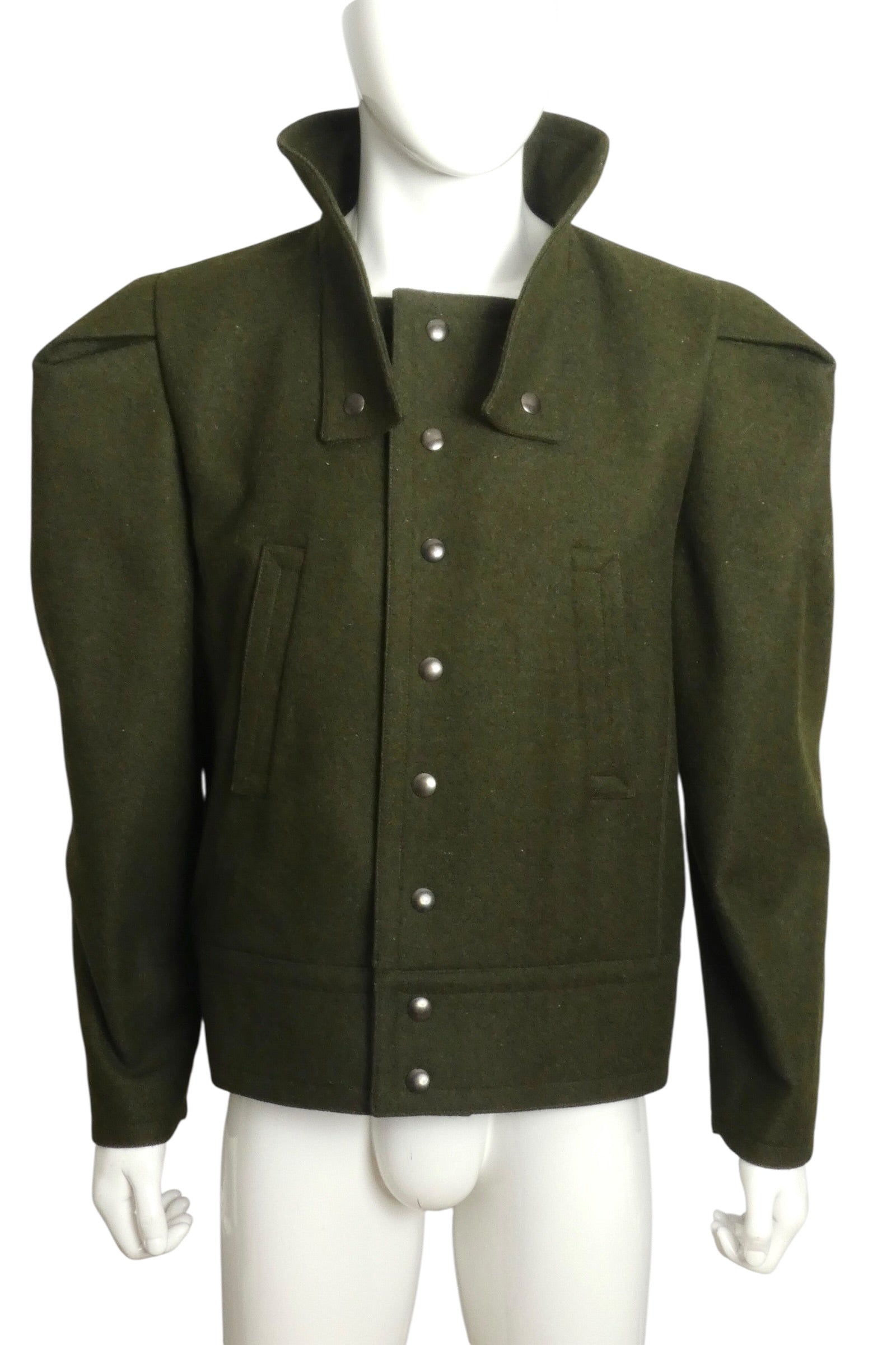 Description: This striking olive green wool jacket merges military heritage with avant-garde design. Crafted from structured wool felt, it features a cropped silhouette with sculpted shoulders and a distinctive high collar adorned with functional snap tabs. Voluminous, pleated sleeves and snap-button front closure echo WWII-era battle dress construction, while the architectural proportions reflect Pierre Cardin's visionary 1990s aesthetic. A rare piece that bridges utilitarian tailoring with Space Age modernism—ideal for collectors of conceptual fashion history.