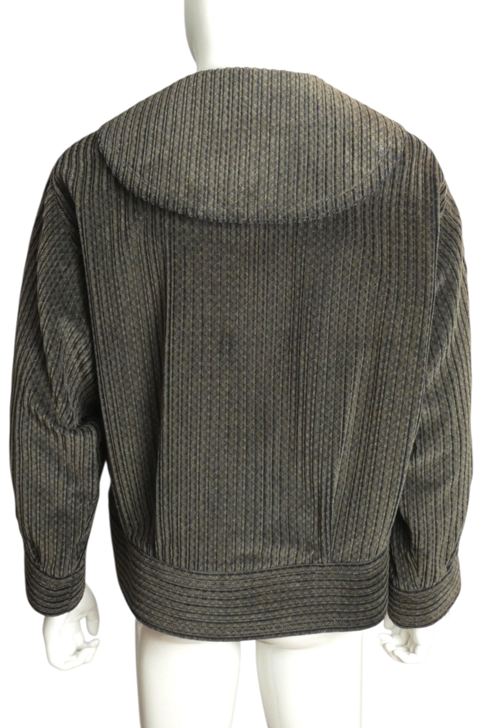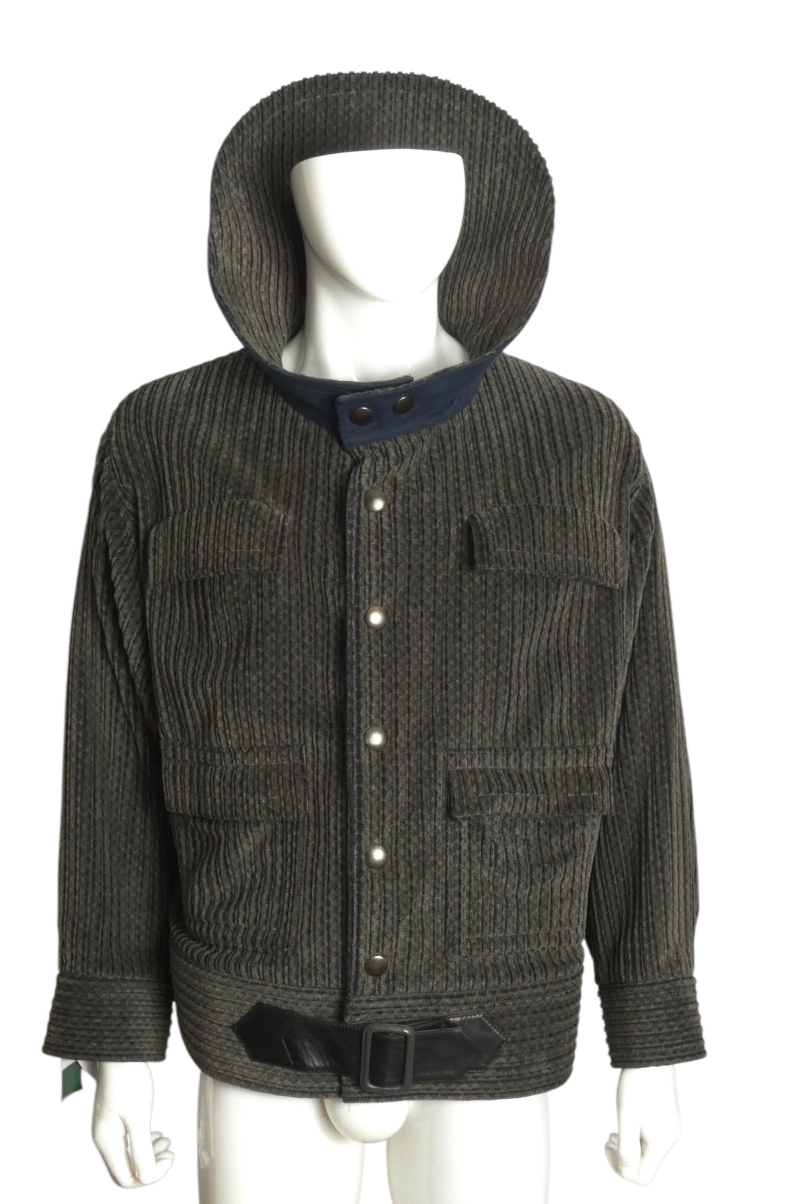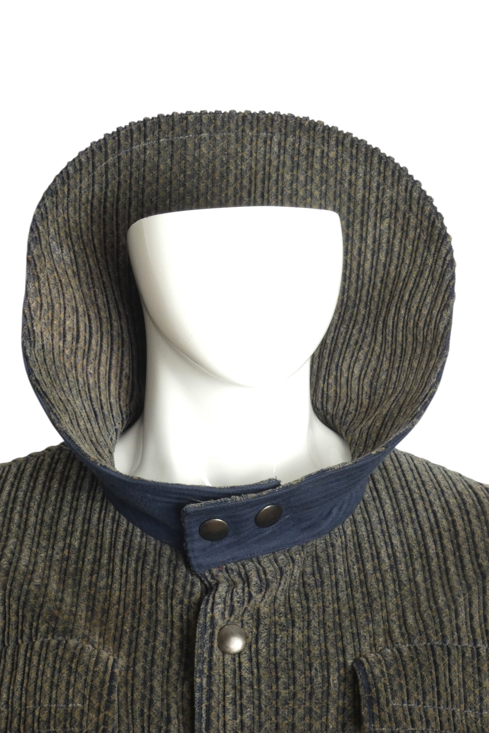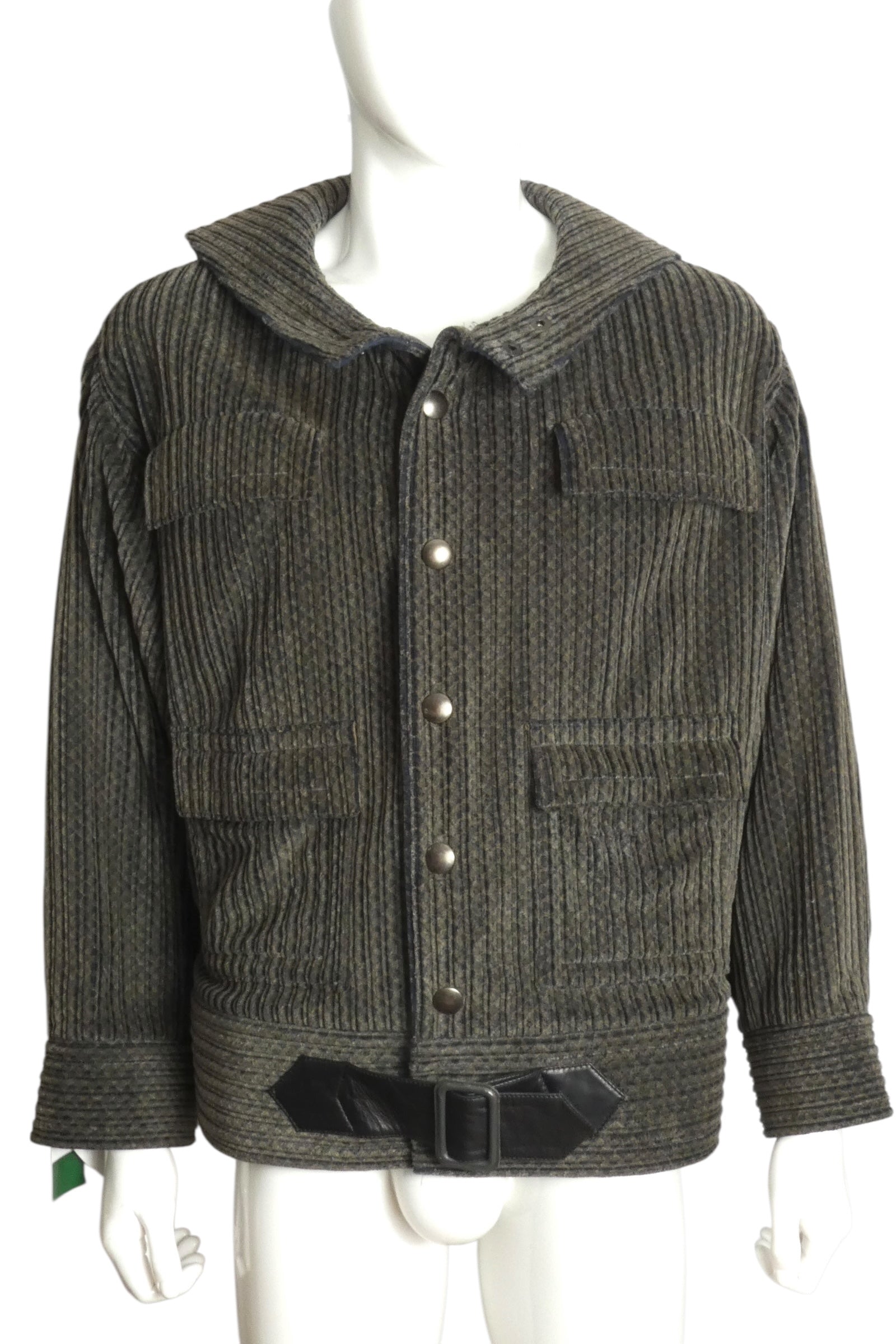 Description: This 1992 Pierre Cardin corduroy coat presents a dramatic diamond print and an oval collar that can stand upright for a striking silhouette. Featuring snap closures both at the front and on the collar, it offers convenient wearability. Four inset flap pockets add practicality, while a wide waistband with a leather strap and buckle at the front ensures a tailored fit. Long sleeves finish with deep cuffs, combining vintage style with refined craftsmanship.