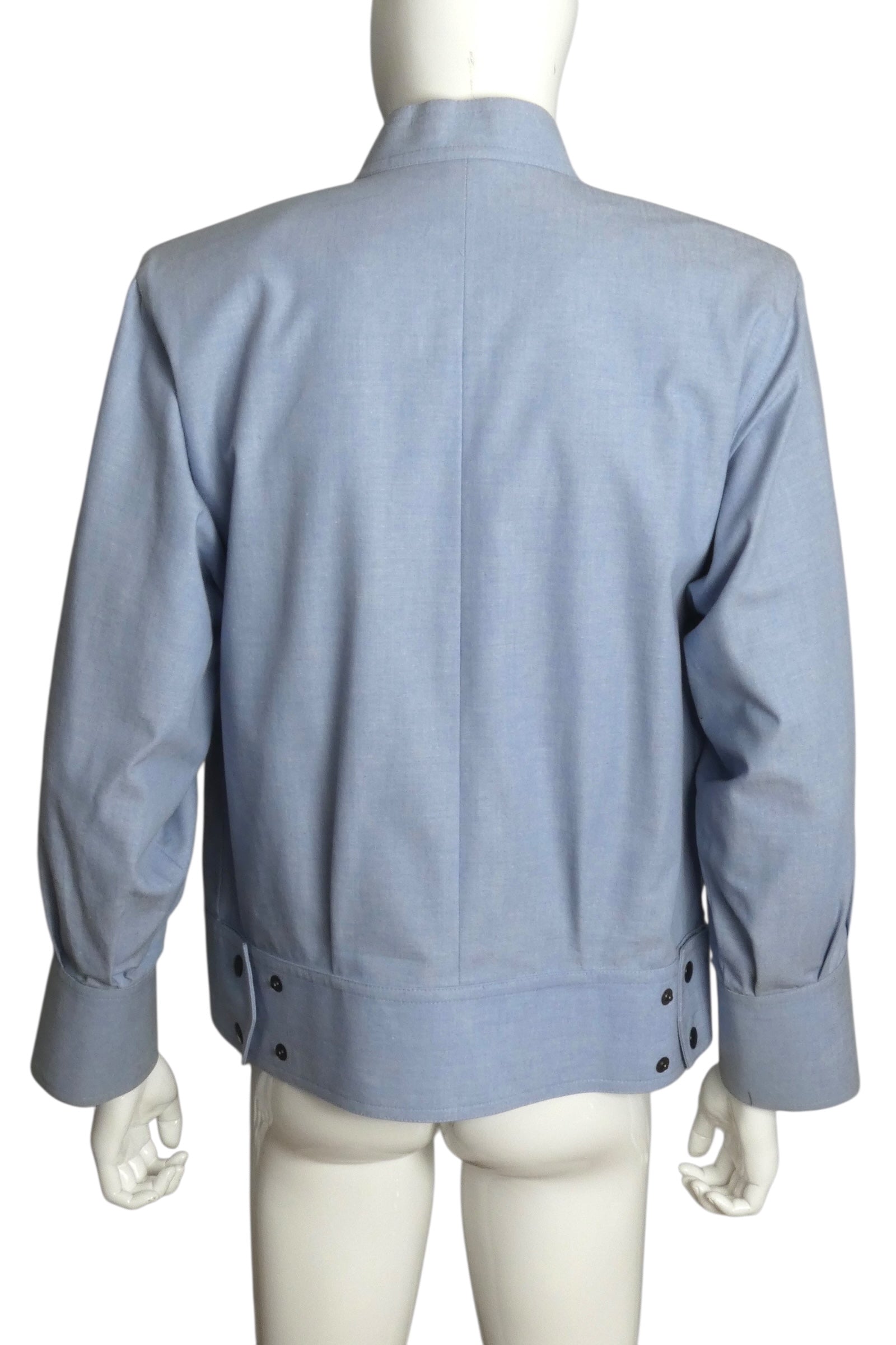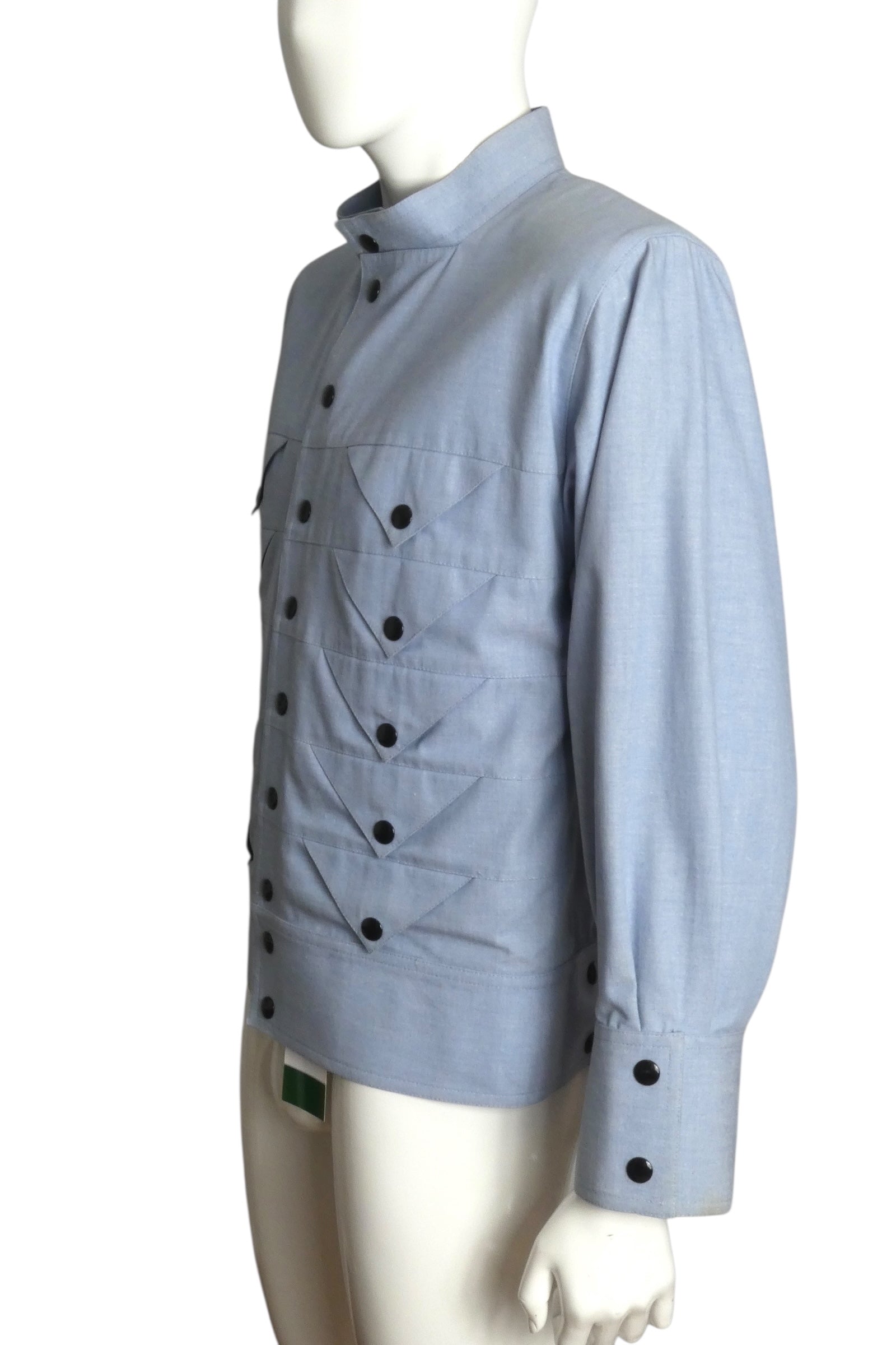 Description: This 1993 Pierre Cardin jacket features a boxy silhouette in light blue cotton, blending classic structure with contemporary style. It is designed with a band collar and snap closures running down the front to a wide waistband. Ten inset pockets with snap-closing flaps line each side of the center front, providing both functionality and visual interest. Tabs with snap closures at the side waistband offer a tailored fit. Sized large, this jacket exemplifies thoughtful design and expert craftsmanship.