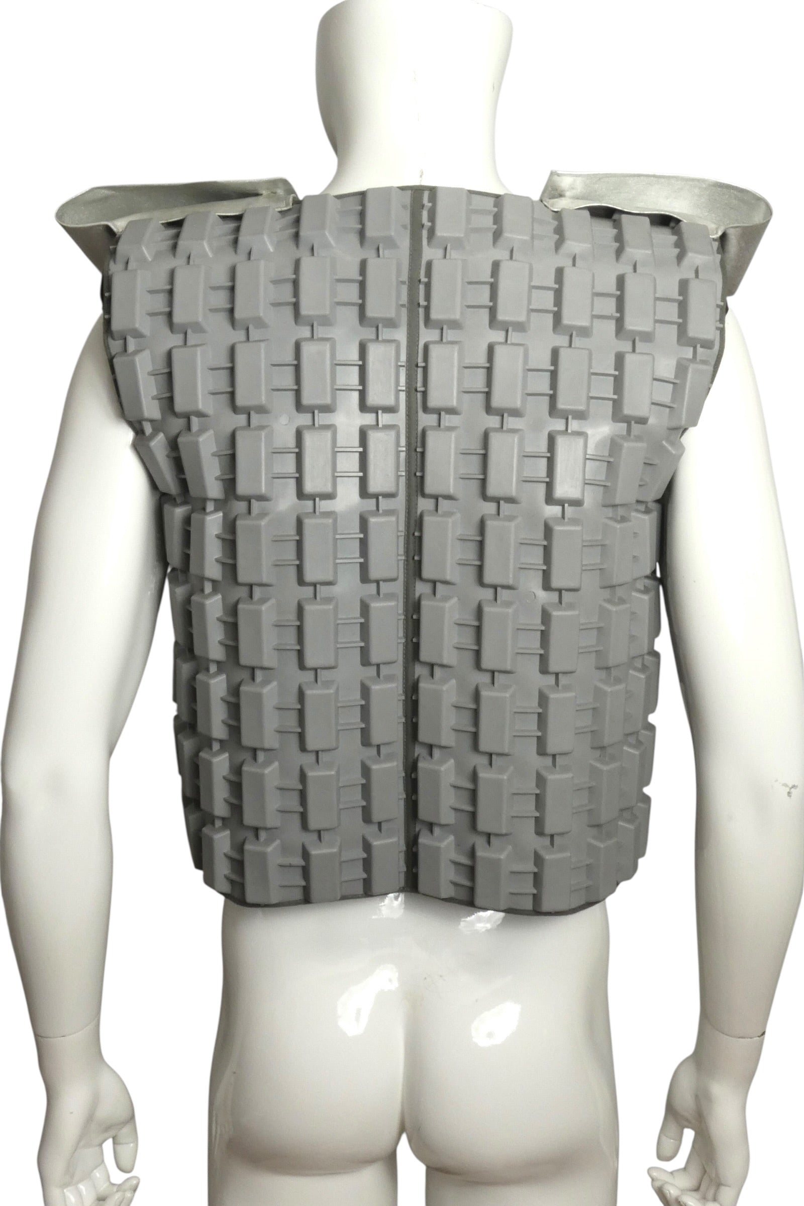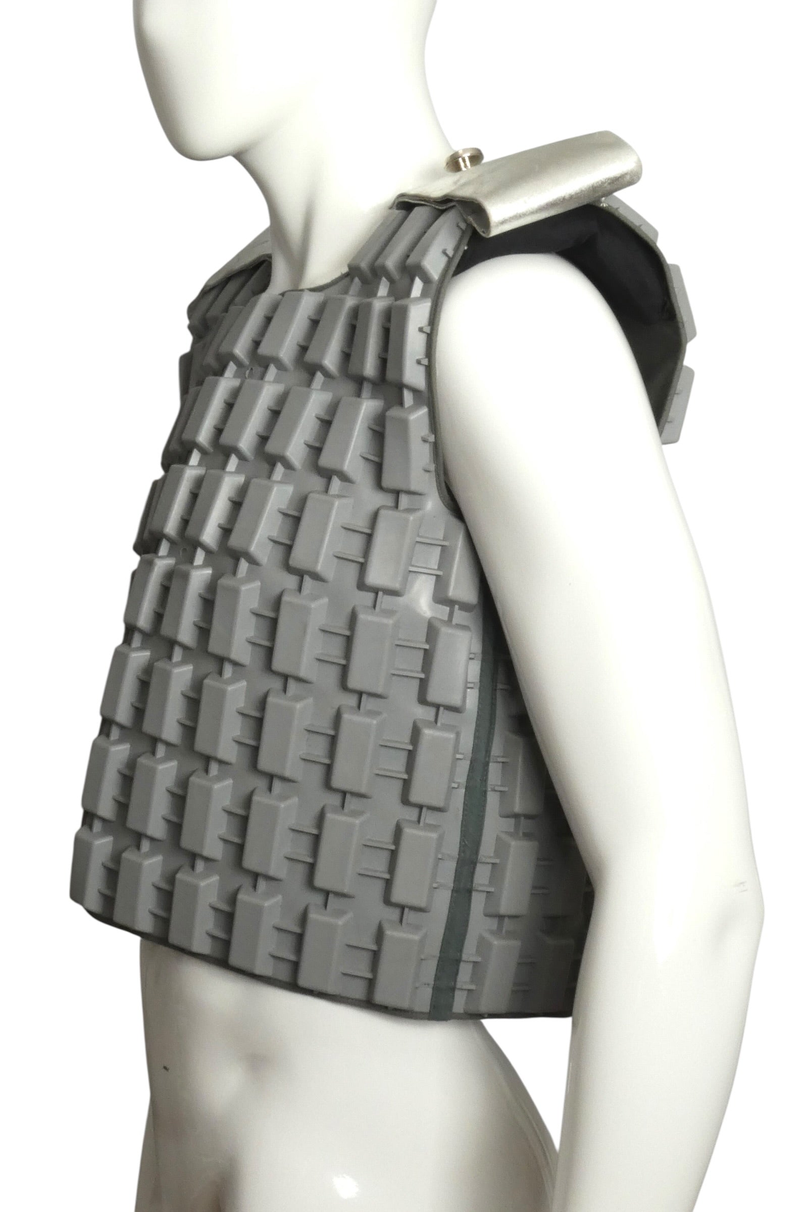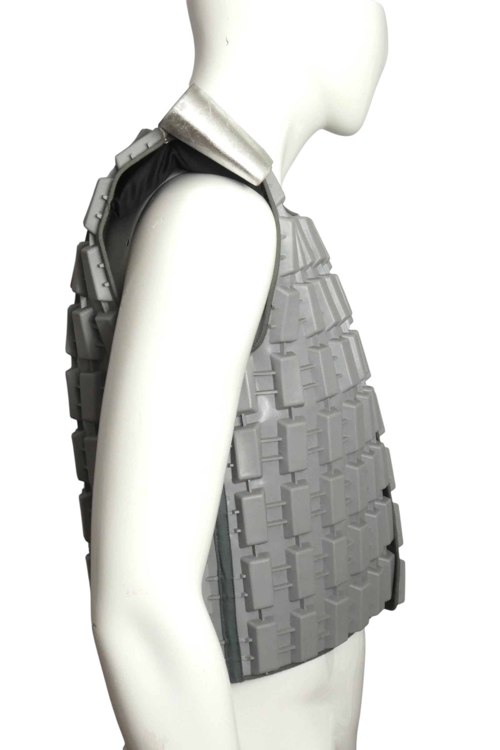 Description: A striking example of Pierre Cardin's visionary approach to fashion, this 1995 grey neoprene armor vest exemplifies his boundary-pushing exploration of unconventional materials. The heavyweight molded rubber construction features a distinctive three-dimensional tire-tread texture that transforms the garment into wearable sculpture. The sleeveless silhouette showcases rigid, architectural shoulder panels with silver epaulettes, creating a bold, futuristic aesthetic. This piece bridges haute couture and industrial design, representing a pivotal moment when Cardin challenged traditional notions of what clothing could be. A museum-quality statement piece for collectors of avant-garde fashion history.