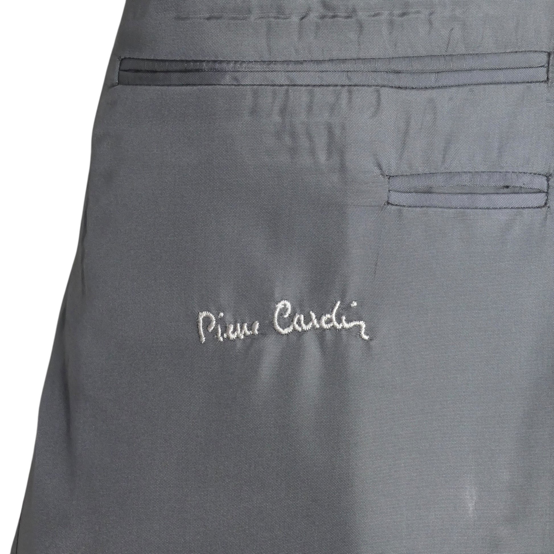 Description: This 2000 Pierre Cardin tuxedo jacket showcases refined craftsmanship in a silk pinstripe fabric. It features notched lapels elegantly covered in black satin, adding a classic touch of sophistication. The double-breasted front creates a distinguished silhouette, while a welt pocket on the chest and inset pockets at the waistline offer practical, polished details. Perfect for formal occasions demanding timeless style.