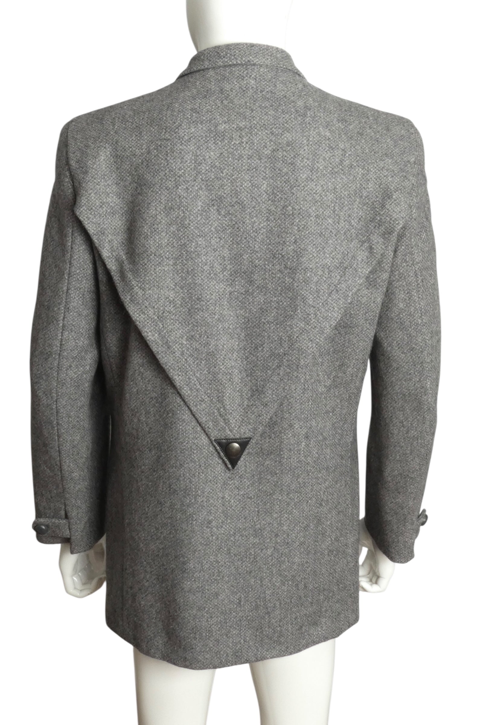 Description: This 2002 Pierre Cardin grey wool blazer from the fall collection combines classic tailoring with unique design elements. It features notched lapels and a single button closure at the waist for a streamlined silhouette. The chest boasts a welt pocket, while flap inset pockets at the waist offer practicality. Long sleeves include side slits with tab and button closures for adjustable comfort. A distinctive triangular panel at the back is accented with a black leather triangle and snap, adding subtle yet striking detail to this finely crafted piece.