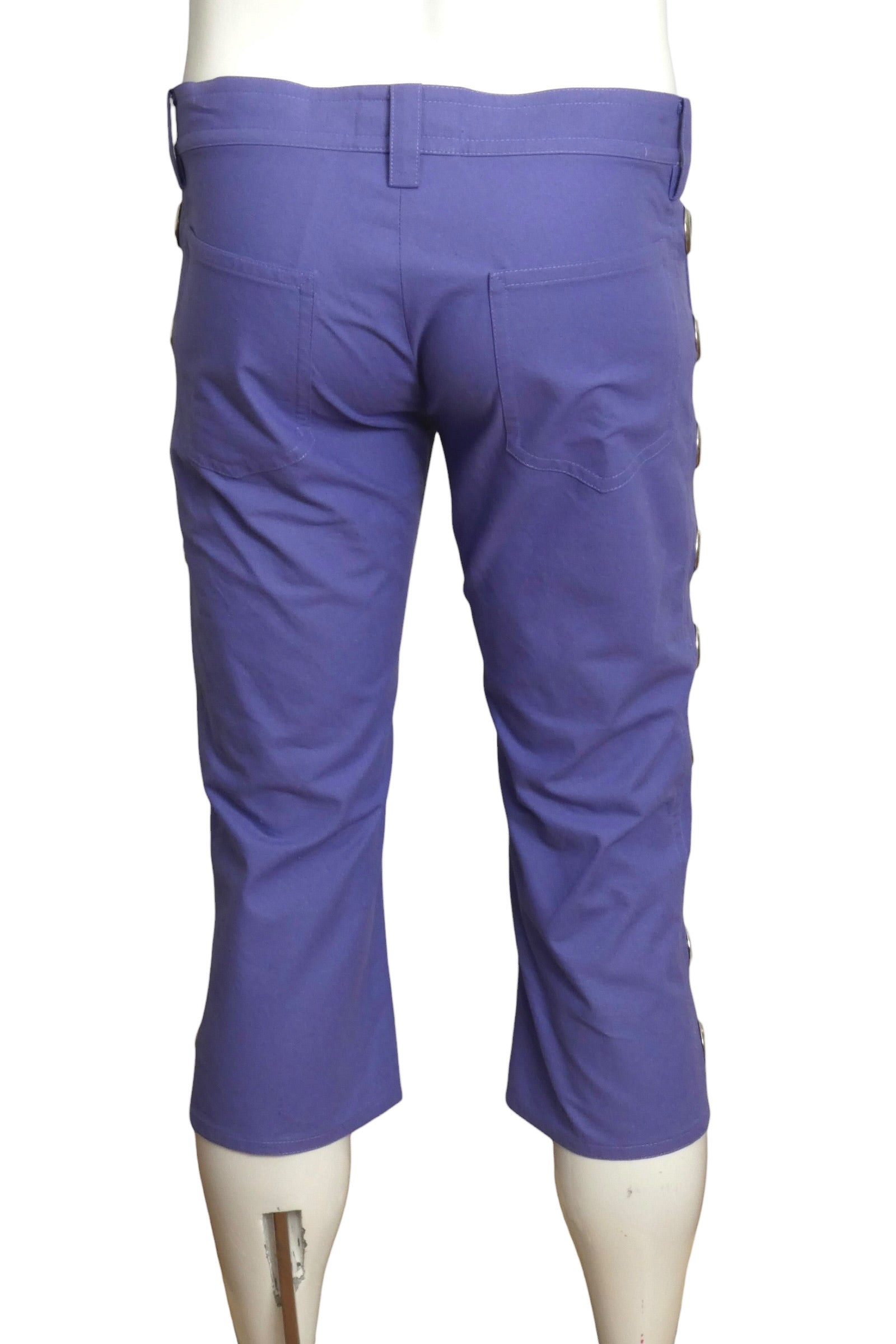 Description: Step into these Pierre Cardin Bermuda shorts from 2006. Crafted in soft cotton, these low-rise capris feature eye-catching silver grommets running down both sides for that signature early-2000s edge. The lavender hue adds a sweet pop of color perfect for vintage lovers and fashion risk-takers alike. A true consignment find that brings back the best of early-2000s style.