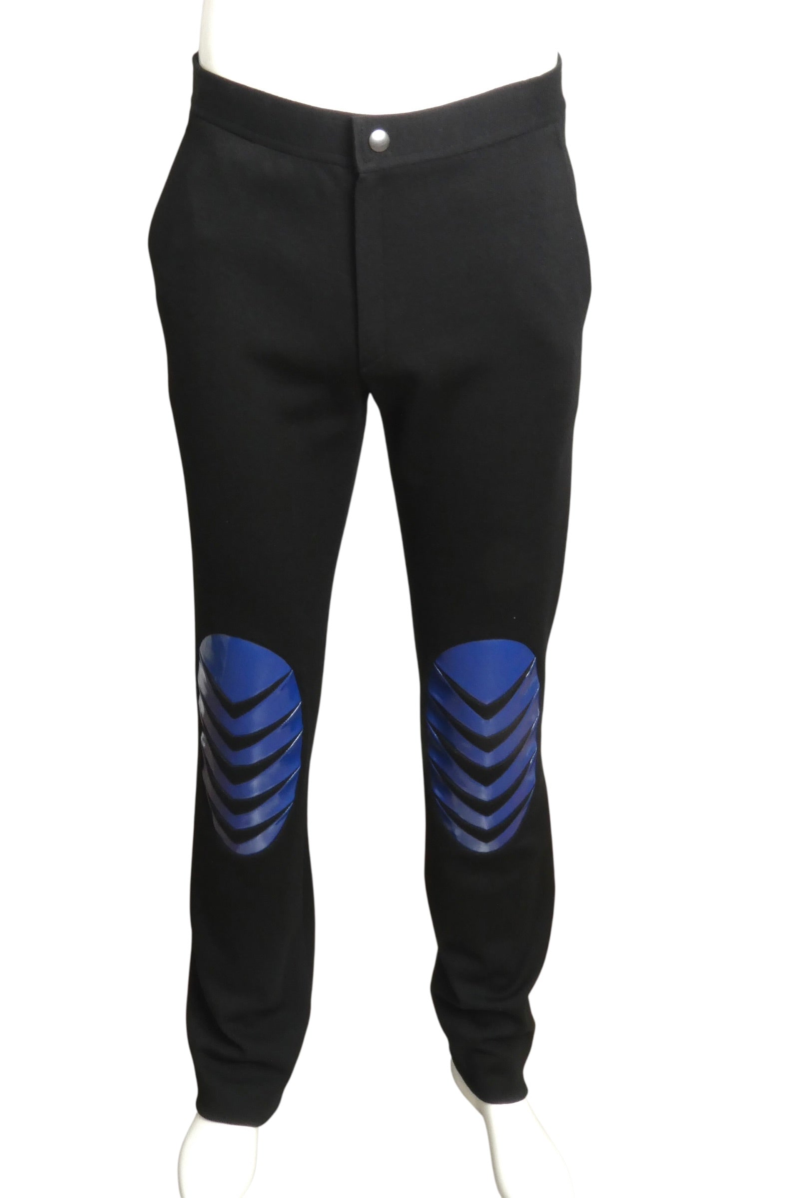 Description: Step into the spotlight with these bold 2007 Pierre Cardin knit pants that demand attention. Crafted from a luxe wool and patent, they feature eye-catching blue vinyl applique patches on the knees that scream vintage edge. The convenient snap closure and inset side pockets keep things practical while you're turning heads. A true statement piece for collectors who appreciate fashion-forward design with personality.