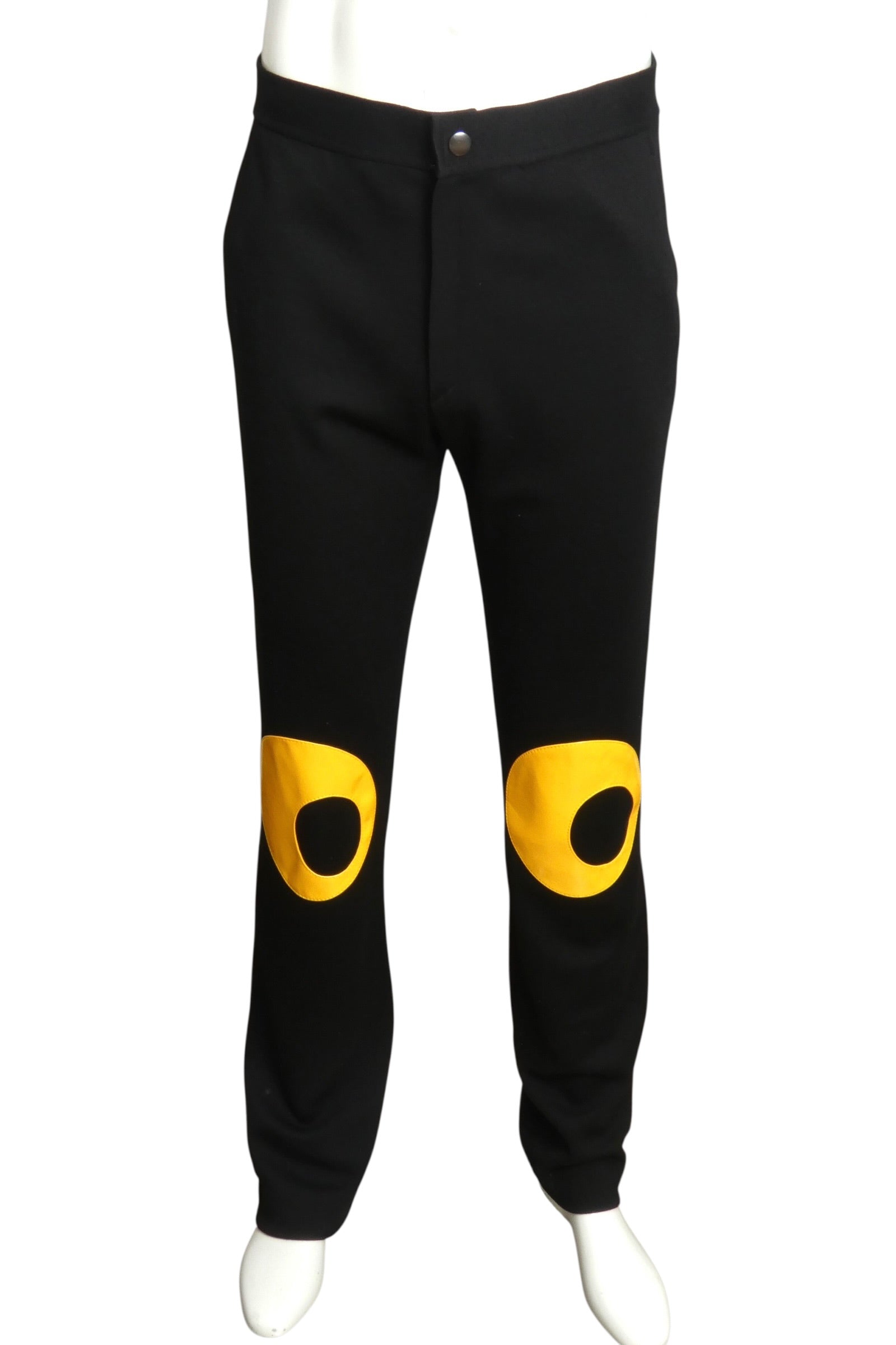 Description: Step into the spotlight with these bold 2007 Pierre Cardin knit pants that demand attention. Crafted from a luxe wool and patent, they feature eye-catching yellow vinyl applique patches on the knees that scream vintage edge. The convenient snap closure and inset side pockets keep things practical while you're turning heads. A true statement piece for collectors who appreciate fashion-forward design with personality.