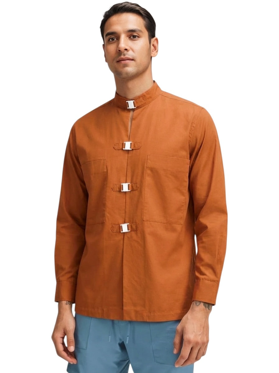 Description: This 1980s Pierre Cardin cotton Mandarin coat features a refined reddish-brown hue and a distinctive band collar. The front is secured with white plastic interlocking clasps, offering both a modern aesthetic and practical closure. Large patch pockets on the chest provide functional style, while the long sleeves conclude with matching clasp details at the cuffs for a cohesive, tailored finish. An excellent example of boutique craftsmanship blending tradition with contemporary design.