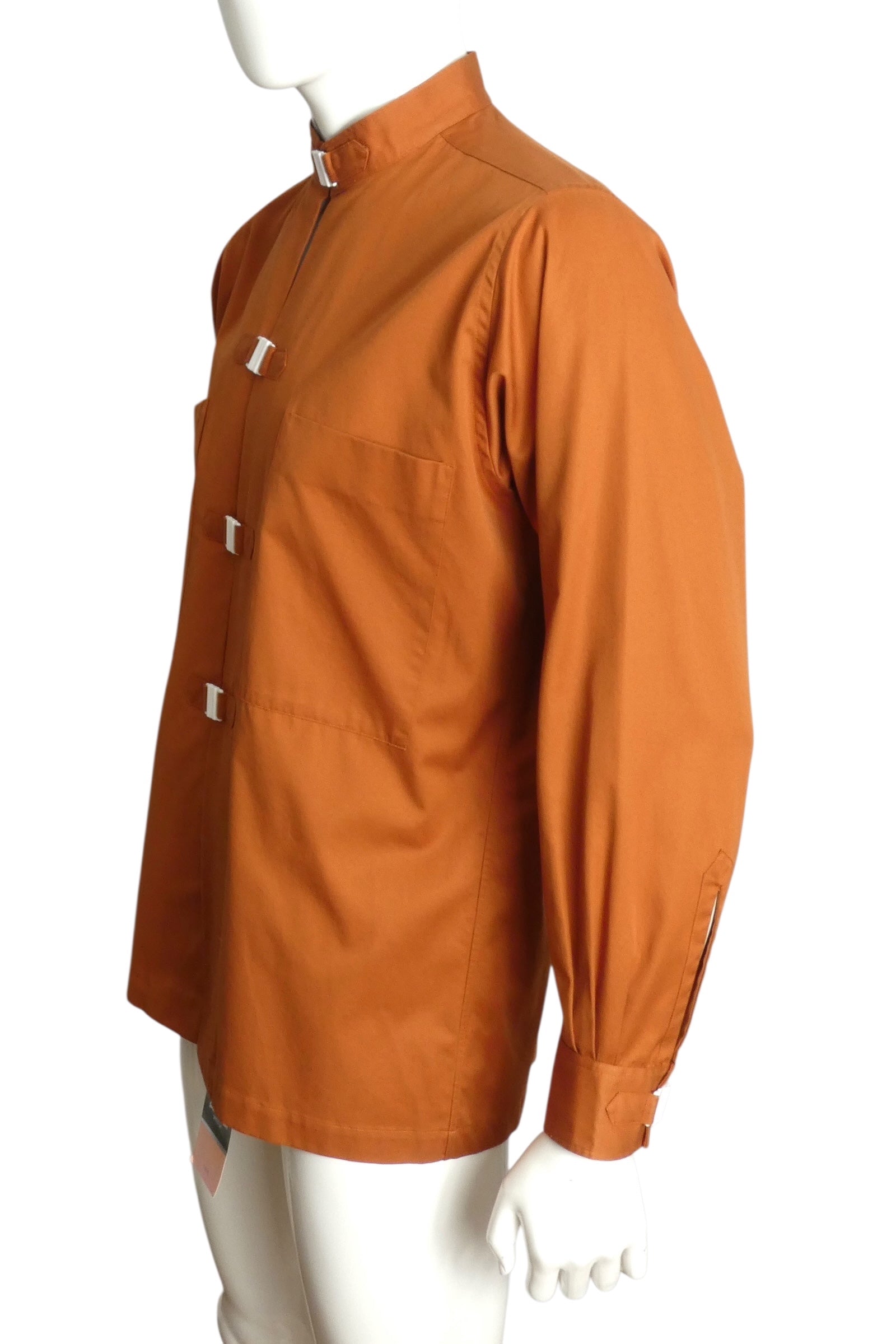 Description: This 2009 Pierre Cardin cotton Mandarin coat features a refined reddish-brown hue and a distinctive band collar. The front is secured with white plastic interlocking clasps, offering both a modern aesthetic and practical closure. Large patch pockets on the chest provide functional style, while the long sleeves conclude with matching clasp details at the cuffs for a cohesive, tailored finish. An excellent example of boutique craftsmanship blending tradition with contemporary design.