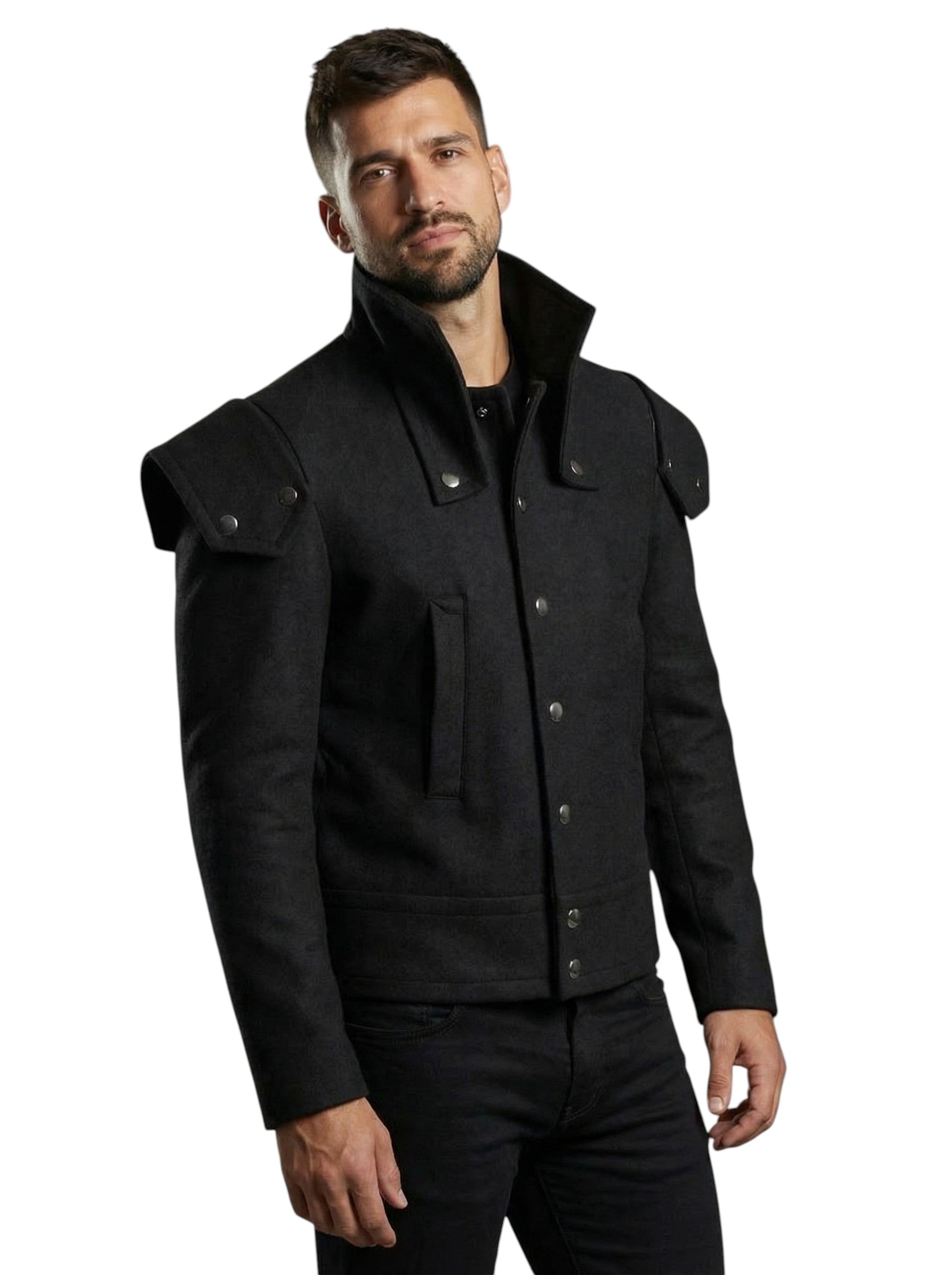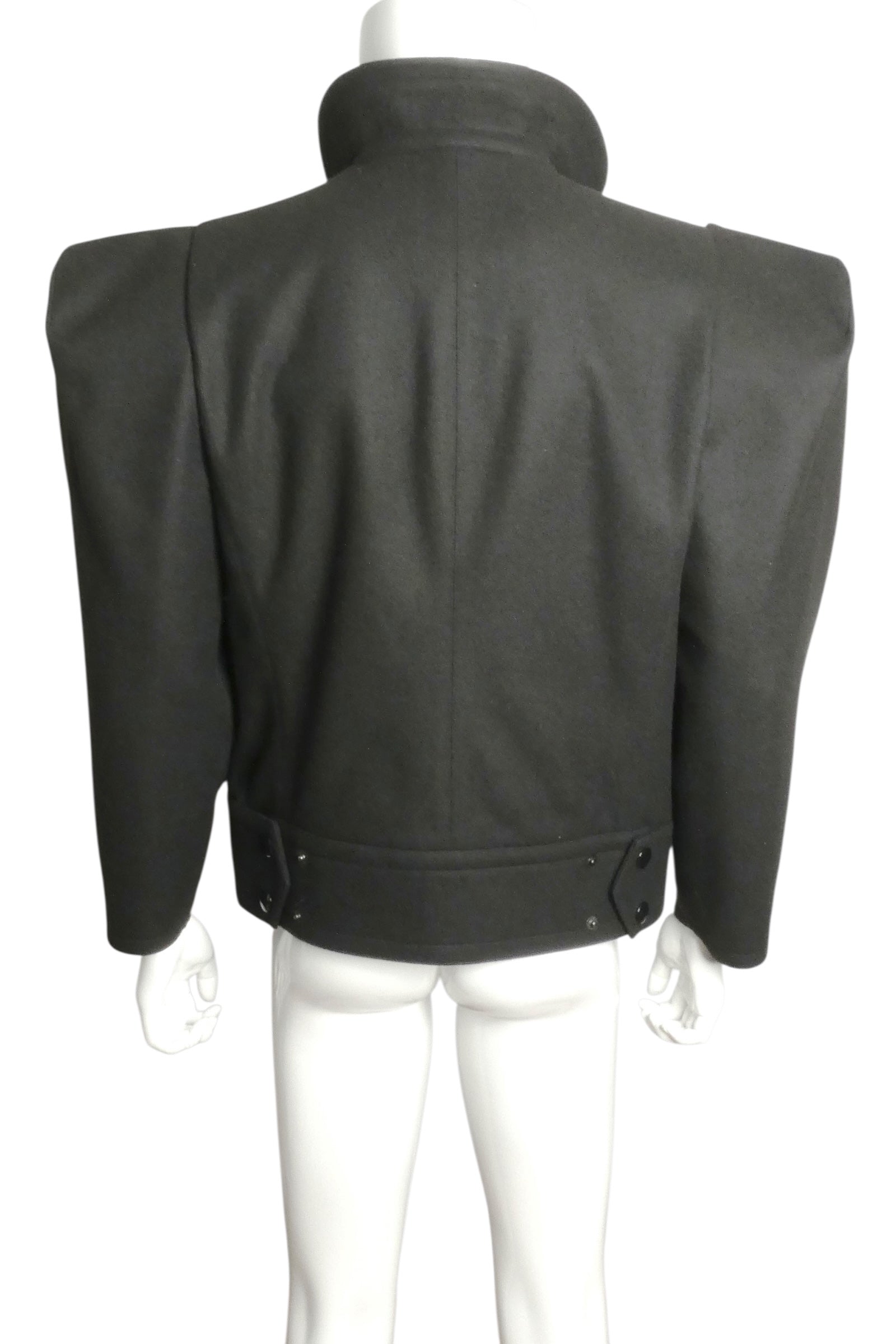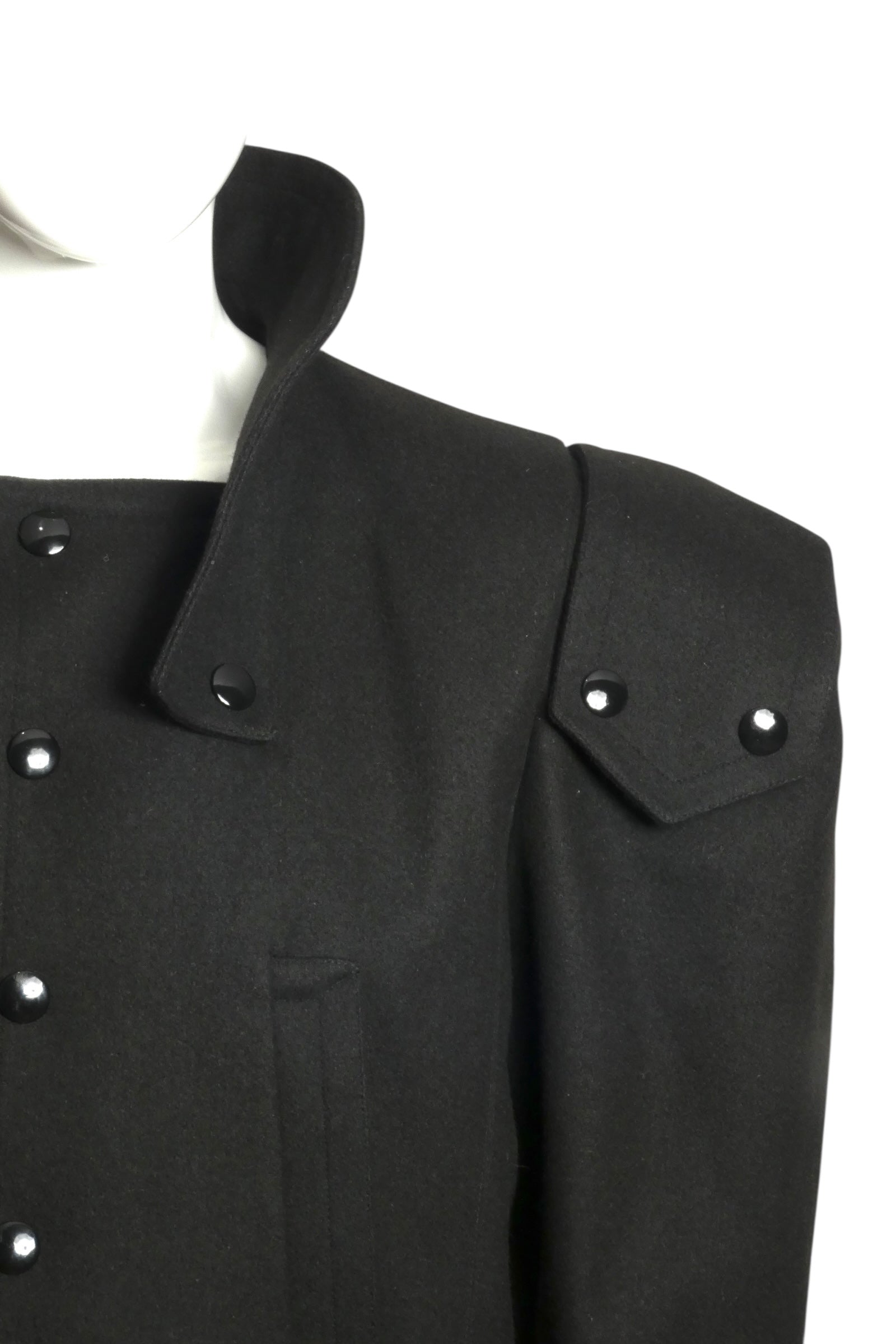 Description: From Pierre Cardin's celebrated 1991 collection, this architectural wool jacket exemplifies the designer's bold approach to tailoring. Crafted in substantial black wool, the piece features a sculptural silhouette defined by dramatic leg-of-mutton sleeves with decorative snap tabs at the shoulders. The fluted collar frames the face with refined structure, while snap closures down the front and across the wide waistband provide both function and visual interest. Vertical welt pockets and side waistband tabs complete this statement piece—a testament to Cardin's innovative design philosophy and impeccable construction.