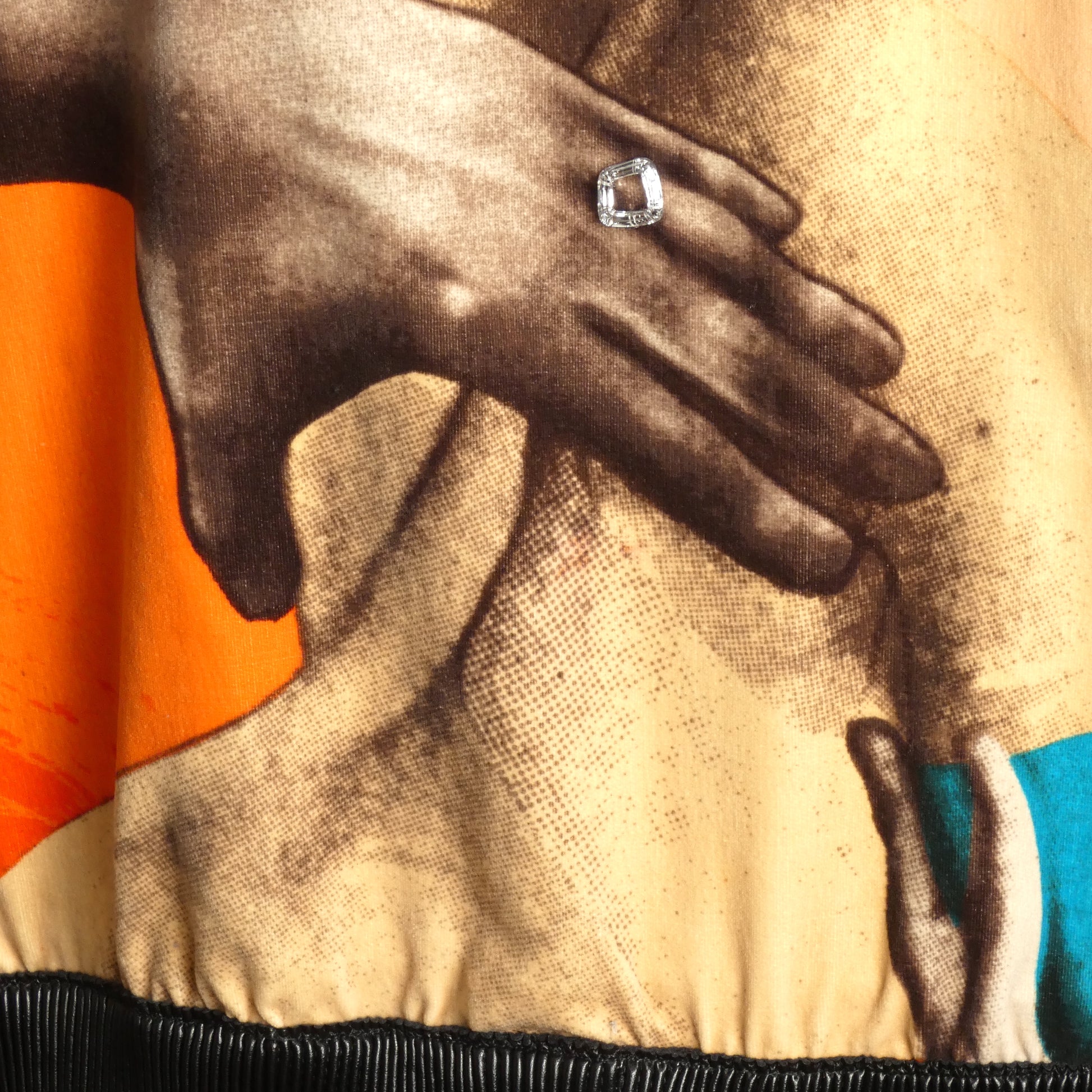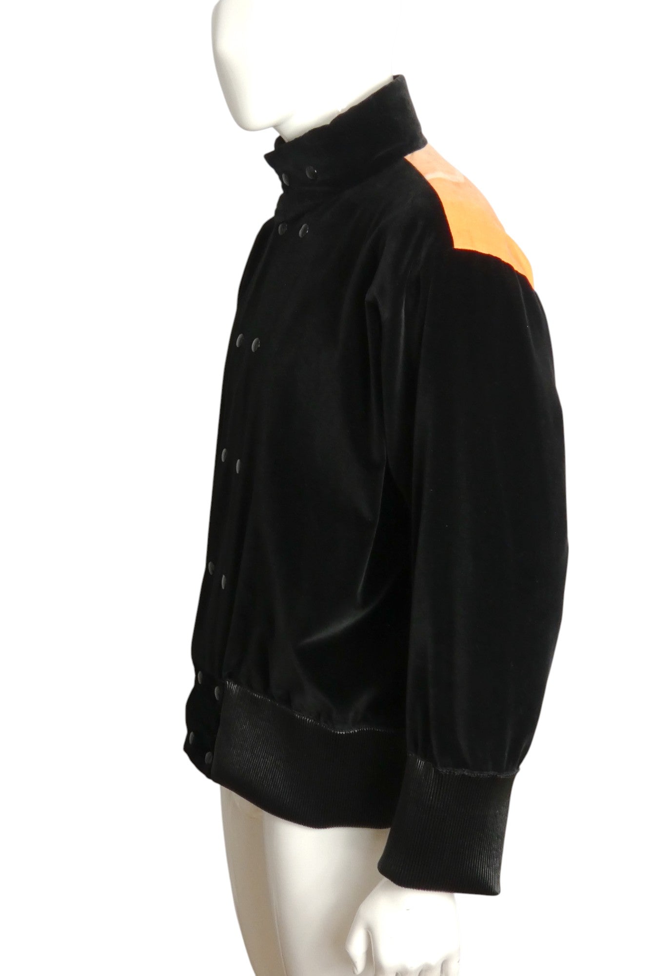 This exceptional Pierre Cardin Boutique piece from the 2007 collection showcases the designer's signature avant-garde aesthetic. Crafted in luxurious velveteen, the jacket features a distinctive tall neckband with snap closures and striking ribbed latex accents at the waistband and cuffs that elevate its contemporary silhouette. The abstract pattern adorning the back demonstrates Cardin's bold approach to graphic design, while a sparkling gemstone ring detail on the hand adds an unexpected touch of glamour. A true collector's item that exemplifies early 2000s luxury fashion innovation.