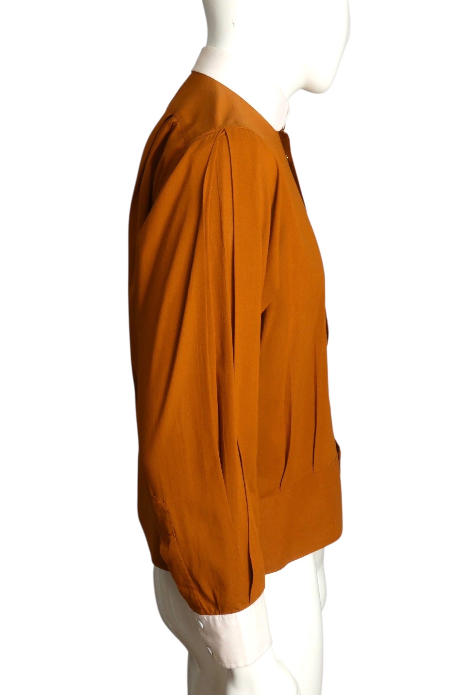 Description: This Pierre Cardin Boutique shirt-jacket from 2002 features a distinctive reddish-brown cotton body contrasted by ivory collar and cuffs. Designed with expert tailoring, it includes a snap tab closure to secure the collar and white snap buttons down the front. The long sleeves showcase inverted pleats along the outer arms, adding refined detail, while a wide waistband and a chest patch pocket combine style with practicality.