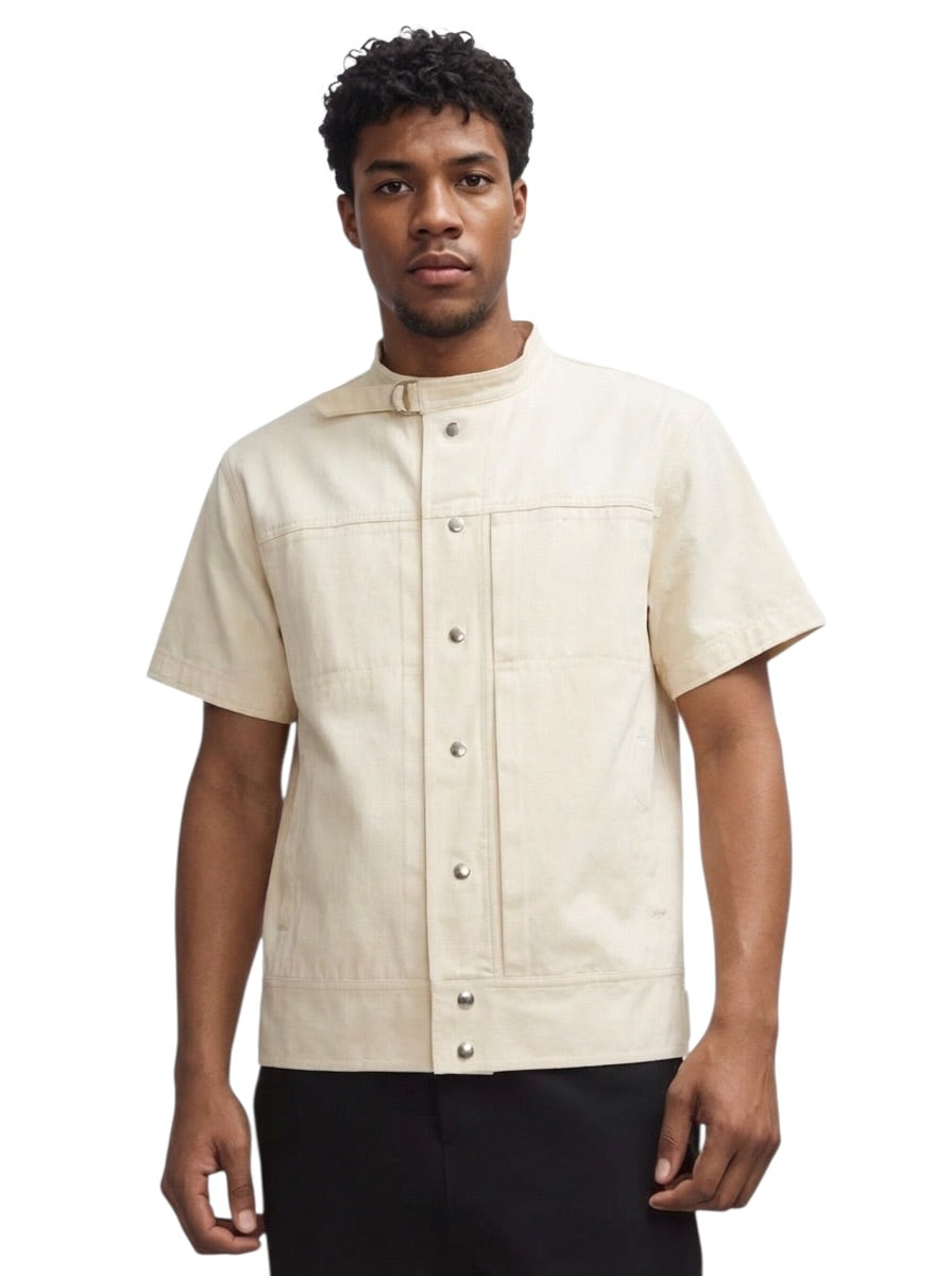 Description: From Pierre Cardin's 1994 collection, this off-white cotton twill jacket exemplifies the era's avant-garde design sensibility. The structured piece features a distinctive band collar with front strap and buckle closure, complemented by snap fasteners running down the front to a pronounced waistband. Functional patch pockets at the chest and stomach provide practical storage, while adjustable side seam straps with buckles allow for customized fit. The back showcases striking decorative circle cutouts—a signature design element that elevates this short-sleeved jacket beyond everyday wear. A notable archive piece for collectors of '90s haute couture.