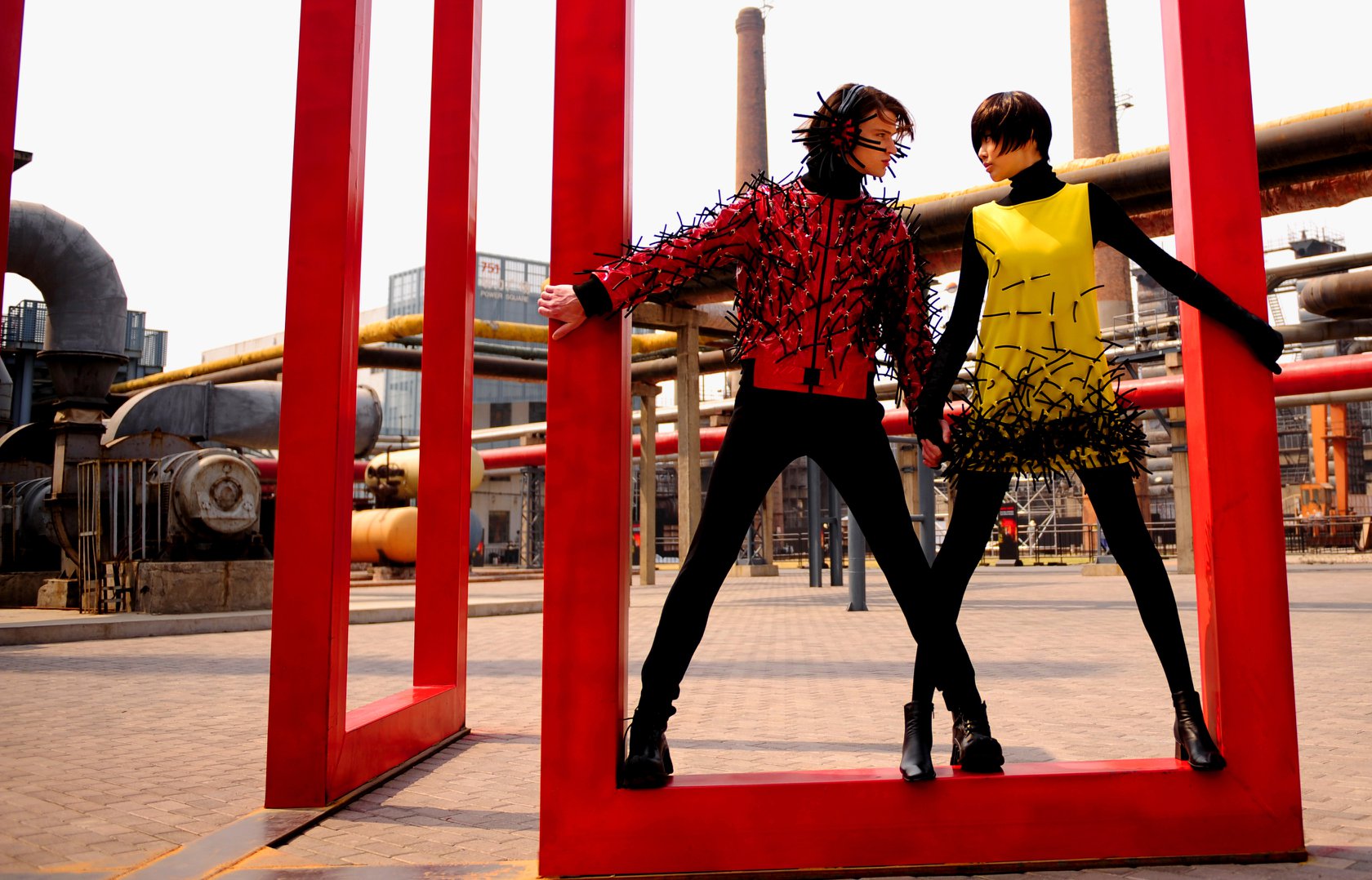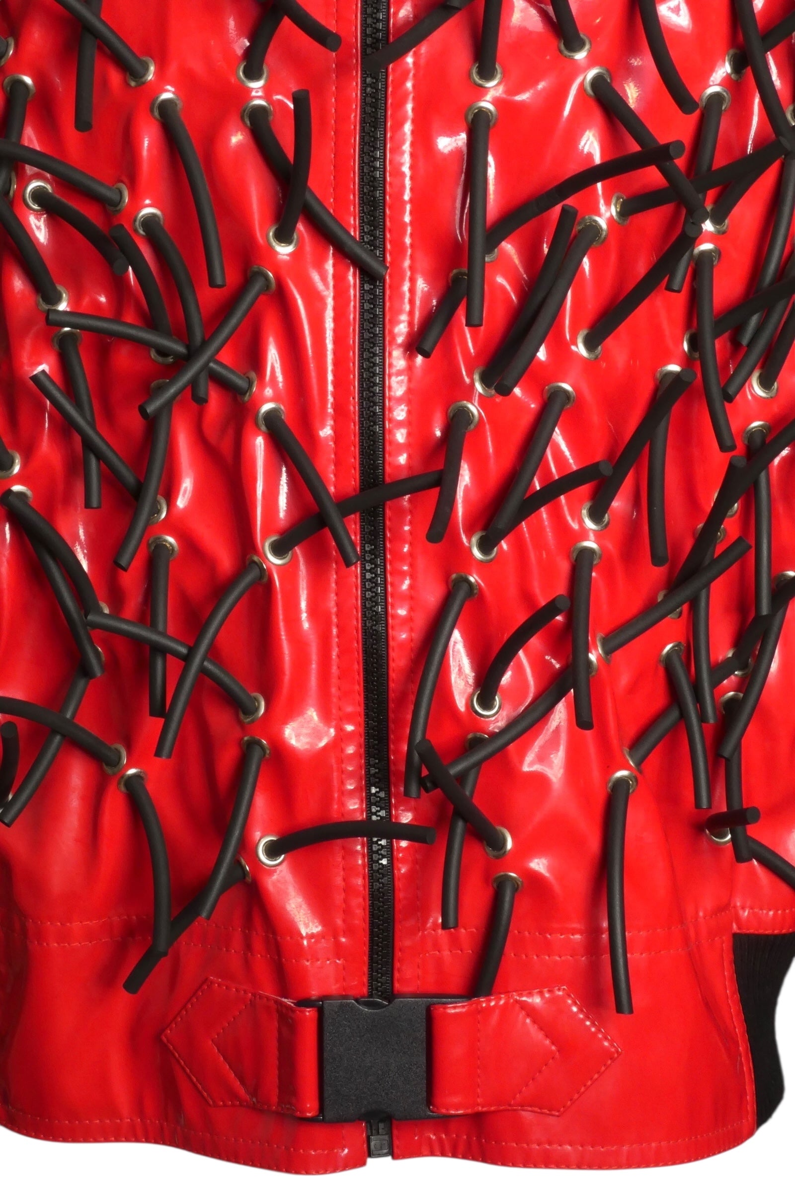 Description: A remarkable piece from Pierre Cardin's design archive, this red patent jacket first appeared in a 2008 photoshoot before being featured in the designer's celebrated 60-year retrospective runway presentation in Fall 2010. The striking crimson patent leather base is grounded by refined black knit ribbing at the collar, waistband, and cuffs, establishing a sophisticated color dialogue. A functional front zipper paired with a locking clasp at the waist provides both security and sculptural silhouette control. The jacket's defining characteristic—an elaborate system of silver grommets threaded with black rubber tubing—creates a dynamic surface treatment that transforms the garment into wearable art. This piece exemplifies Cardin's fearless exploration of unconventional materials and three-dimensional construction, making it an invaluable addition to any serious haute couture collection.