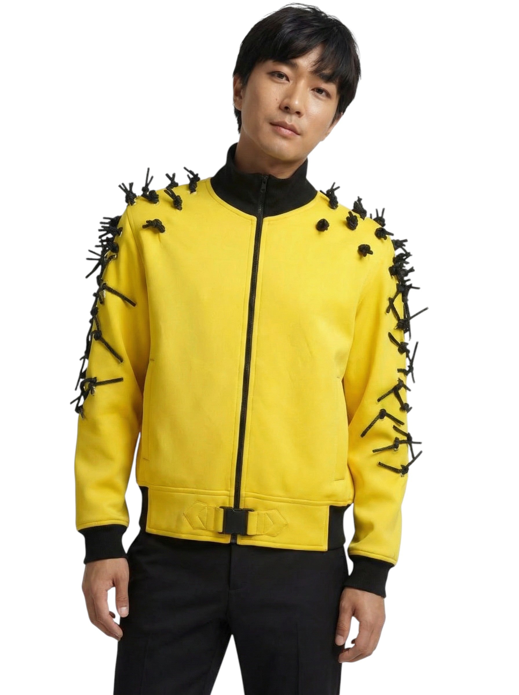 Description: A tour de force from Pierre Cardin's Spring 2012 collection, this architectural yellow neoprene jacket pushes the boundaries of contemporary design. The vibrant base is anchored by refined black knit ribbing at the collar, cuffs, and waistband, creating visual balance and textural contrast. A front zipper closure paired with a locking clasp at the waist ensures both security and sculptural definition. The jacket's most striking feature—an intricate network of silver grommets interspersed with knotted black rubber tubing—transforms the surface into a dynamic three-dimensional composition. This avant-garde piece exemplifies Cardin's mastery of unconventional materials and experimental construction, making it an essential collector's item for those who appreciate haute couture's most daring innovations.