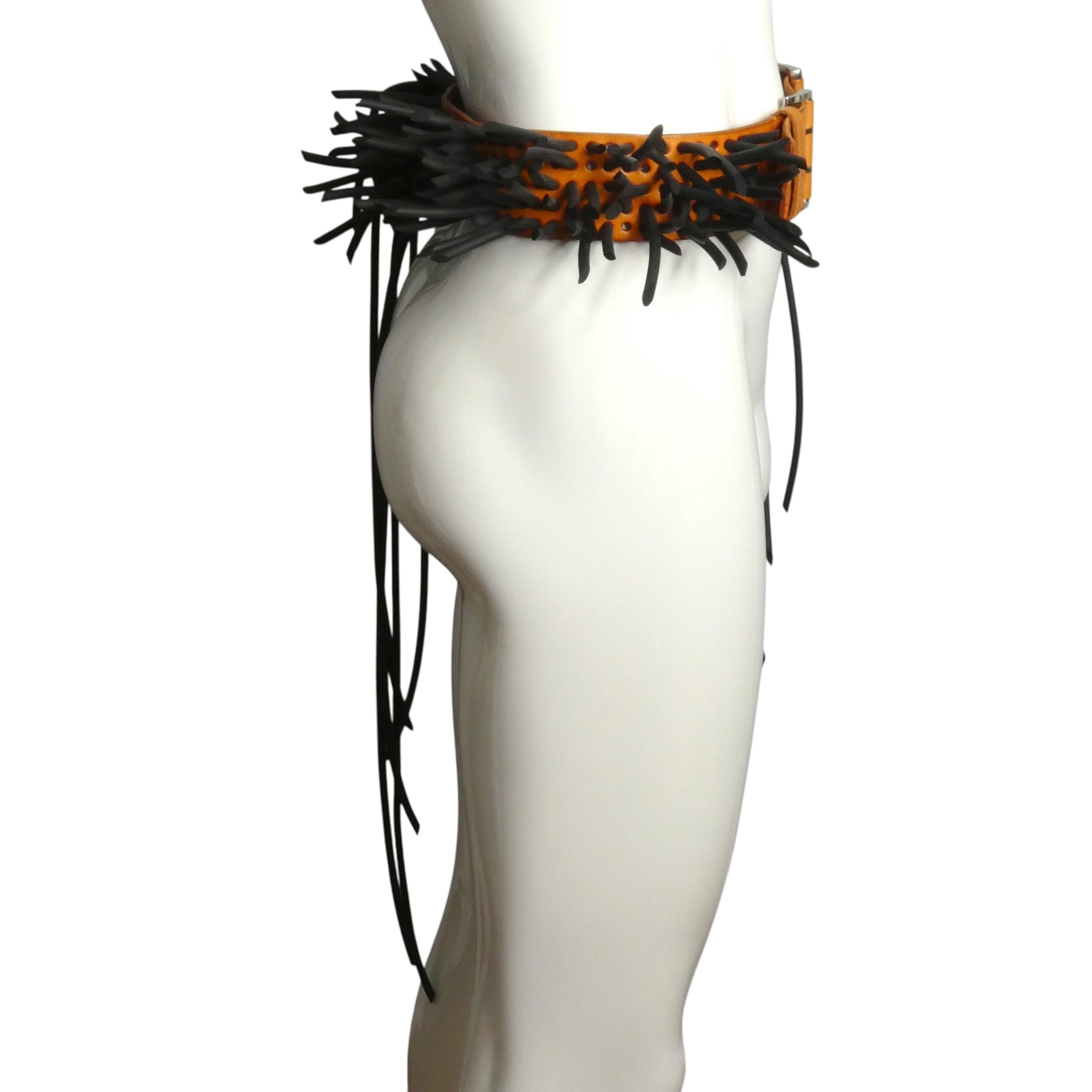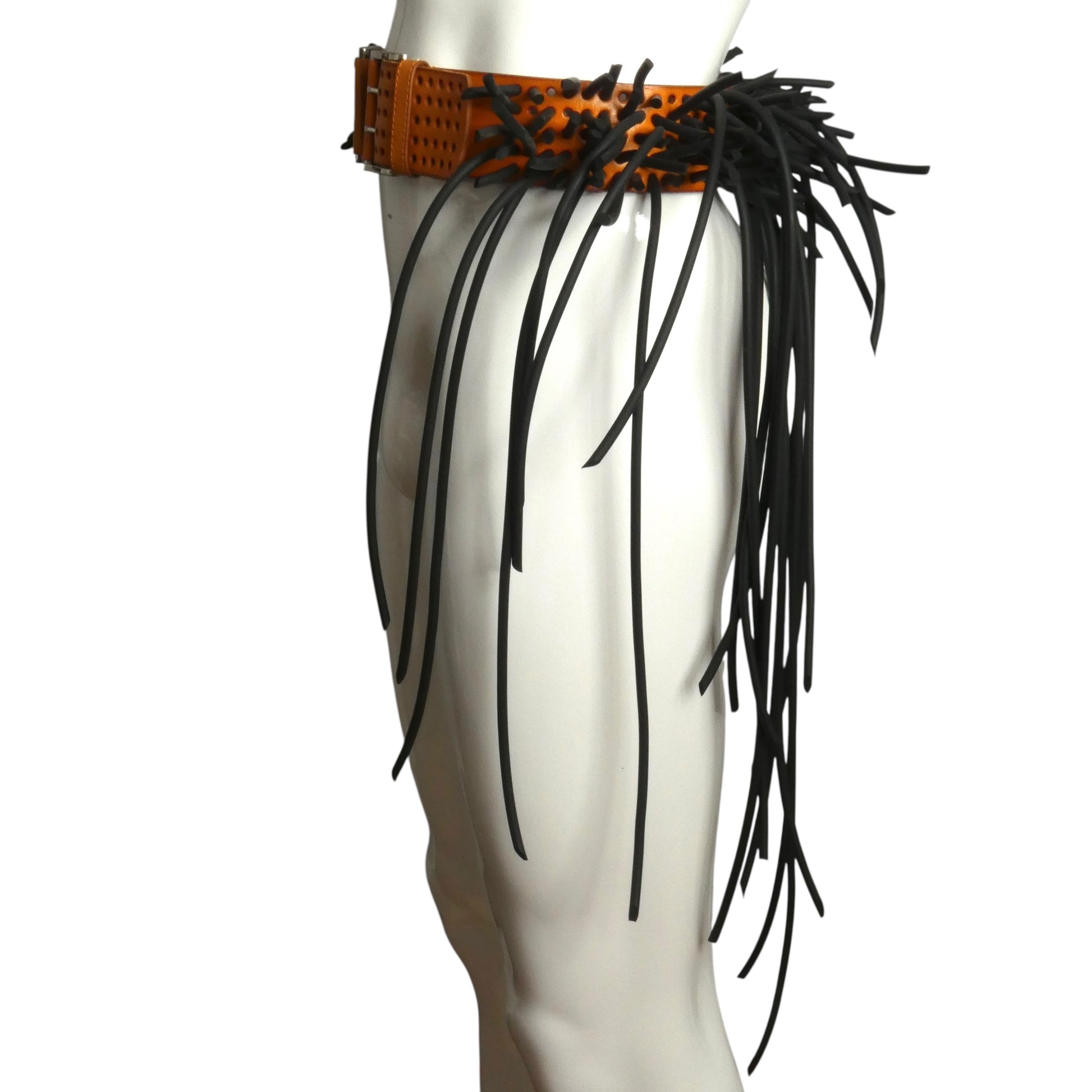 Description: This 2011 Pierre Cardin runway piece is a bold statement in architectural fashion. Crafted from rich brown leather punctuated with precise perforations, the belt features striking black rubber tubing threaded through each hole, creating a sculptural three-dimensional effect. The adjustable center strap and double-ended buckle offer versatile styling options while maintaining the design's avant-garde edge. A fearless accessory for those who refuse to blend in—wear it as the conversation-starting centerpiece it was meant to be.