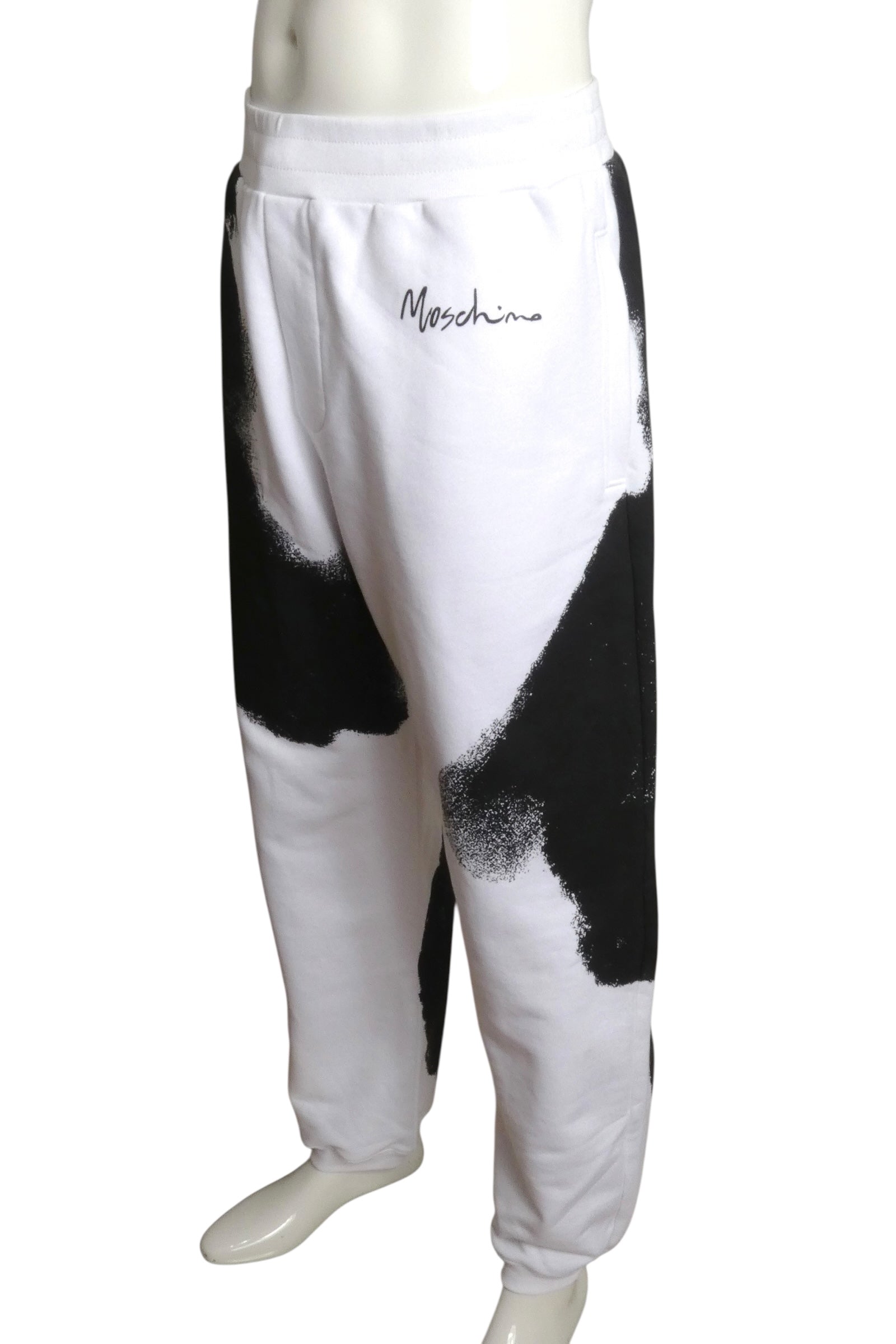 Description: Step up your casual game with these MOSCHINO COUTURE joggers in crisp white cotton, splashed with bold black spray paint details. Featuring a comfy drawstring waistband and handy side seam pockets, they bring street style and function together. Brand new with tags, these size Large joggers promise effortless cool wherever you go.