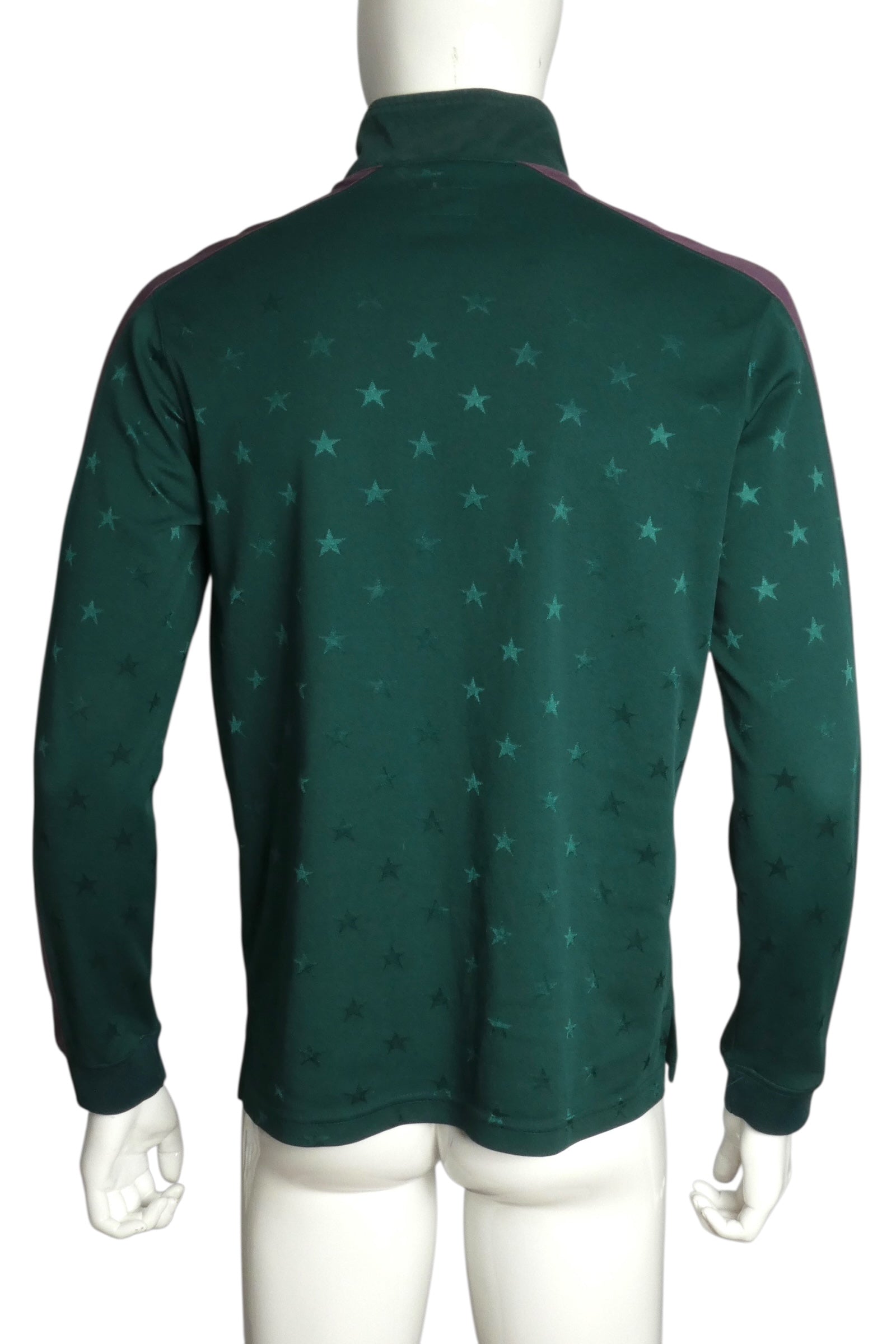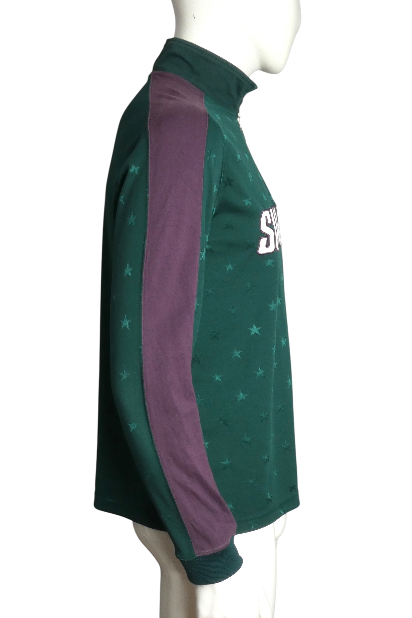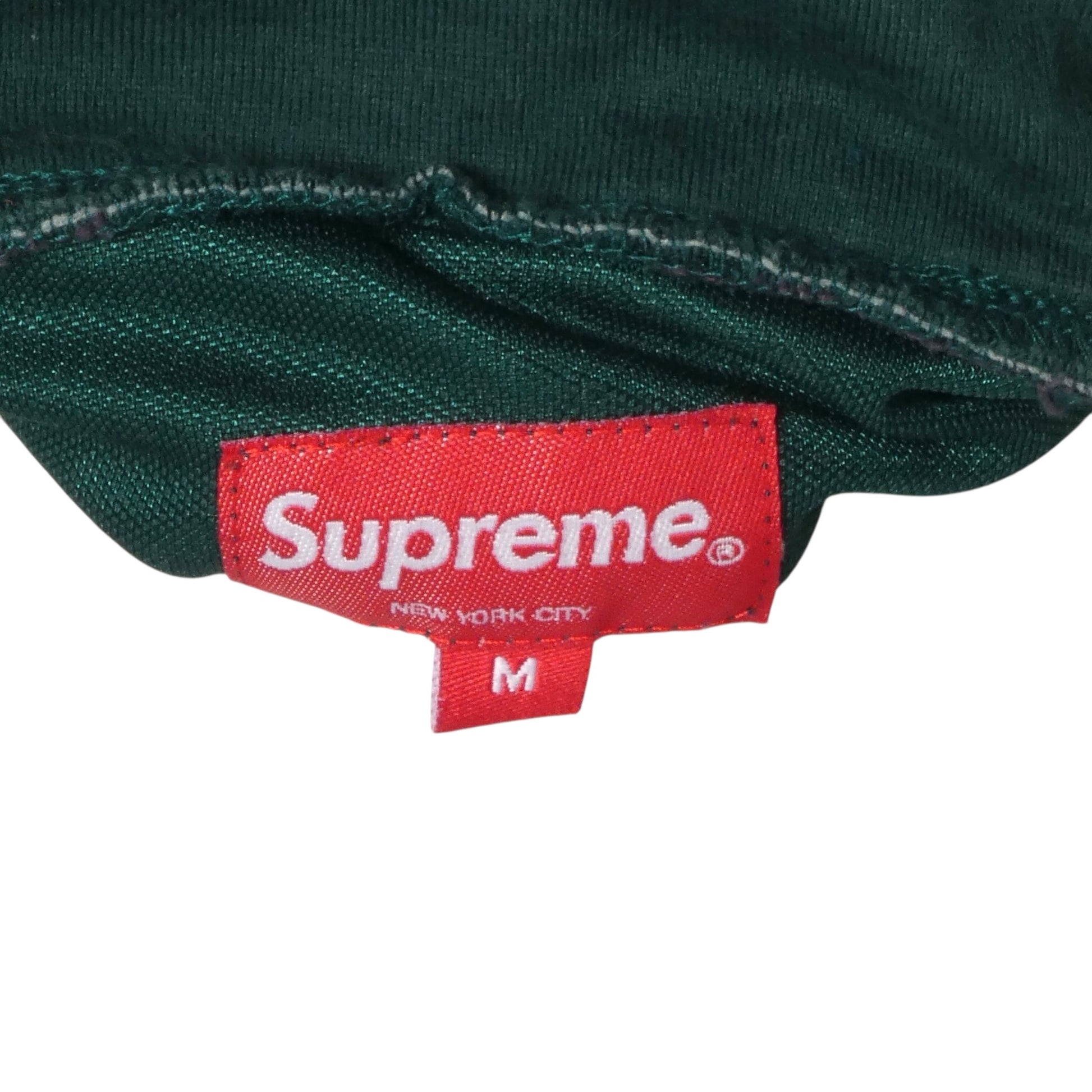Description: Supreme's Fall/Winter 2018 Track Half Zip Pullover is chromatic rebellion in knit form. Dark green jacquard base studded with stars creates visual texture that demands attention, while purple contrast panels on the sleeves deliver unexpected color collision. The "SUPREME" logo claims the chest in appliqué—a declaration of allegiance rendered in dimensional thread. The half-zip construction adds functional edge to a silhouette that refuses to play it safe. Size Medium. This is Supreme at its most visionary, proving that sportswear can be art, that color can be weaponized, and that a pullover can absolutely change how you move through the world.