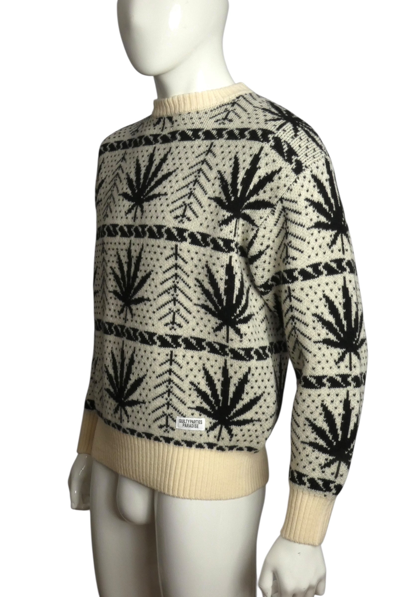 Description: This is the ultimate rebel's sweater—a Wacko Maria x High Times collaboration that refuses to whisper. Featuring an iconic marijuana leaf pattern woven throughout, this wool knit arrives in striking off-white and black colorways that demand attention. The classic crew neck, ribbed cuffs, and reinforced hem deliver timeless construction, while the bold graphic storytelling speaks volumes about your aesthetic. Size Small. A rare piece that merges underground culture with premium craftsmanship—for those who wear their convictions on their sleeve.