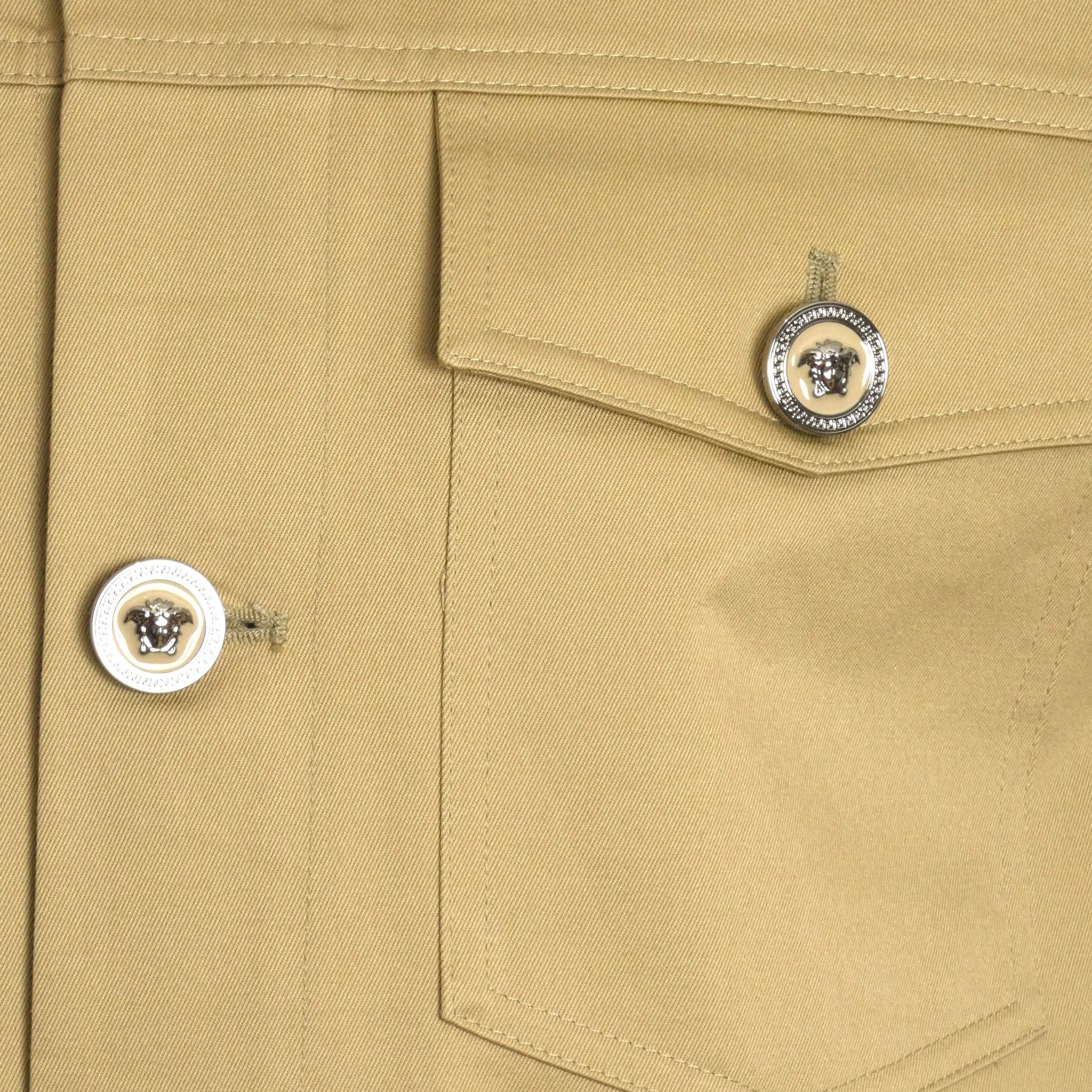 Description: From the spring 2024 collection, this khaki cotton twill utility shirt plays with classic style and bold details. Featuring eye-catching enamel Medusa head buttons, it offers a fun twist on a button-down collar and long sleeves with buttoned cuffs. Practical yet stylish, it includes two button-fastening chest pockets and a curved hem for easy layering. Perfect for adding a versatile edge to your wardrobe with a dash of luxury flair.