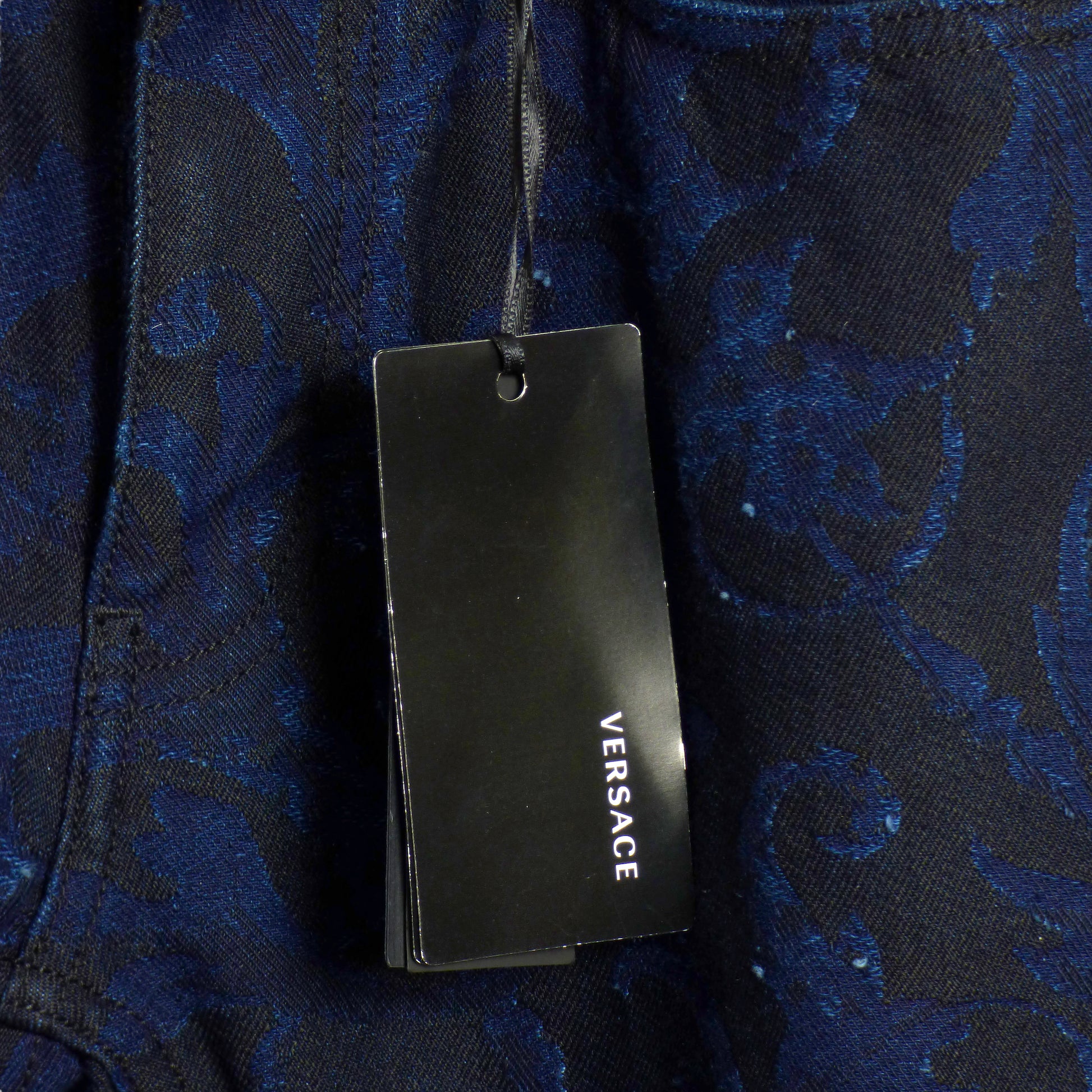 Description: Denim jeans with a baroque jacquard pattern throughout. The jeans have a metal button at the waist and a zipper fly. Inset pocket on the front and patch pockets on the back. Still has the original tags attached with a price of $800.00